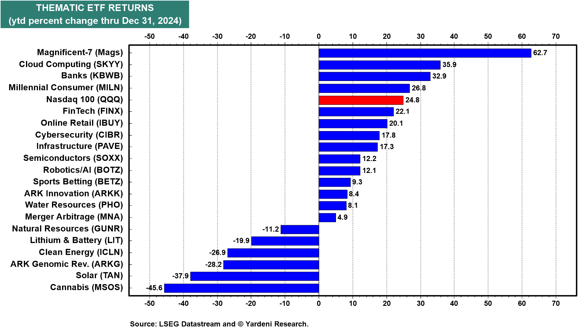 (5) Among thematic ETFs, the year's outperformers were the Mag-7 and other ETFs that focus on technology. The big losers were ETFs that bet on clean energy and pot. We expect the same in 2025.