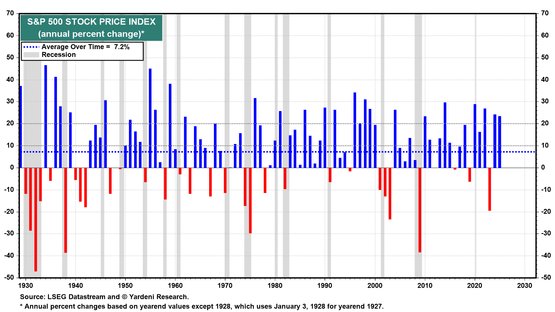 This is the time of year when we all wish one another a healthy, happy, and prosperous new year. The past two years were certainly prosperous ones for equities investors, as the S&P 500 rose 23.3% following a 24.2% gain in 2023. Those gains more than offset the 19.4% loss during 2022. On average, the S&P 500 is up 9.4% per year over the past three years, consistent with its long-run average growth rate of 7.2% (chart). Of course, accounting for dividends, returns are even higher than that performance suggests.
