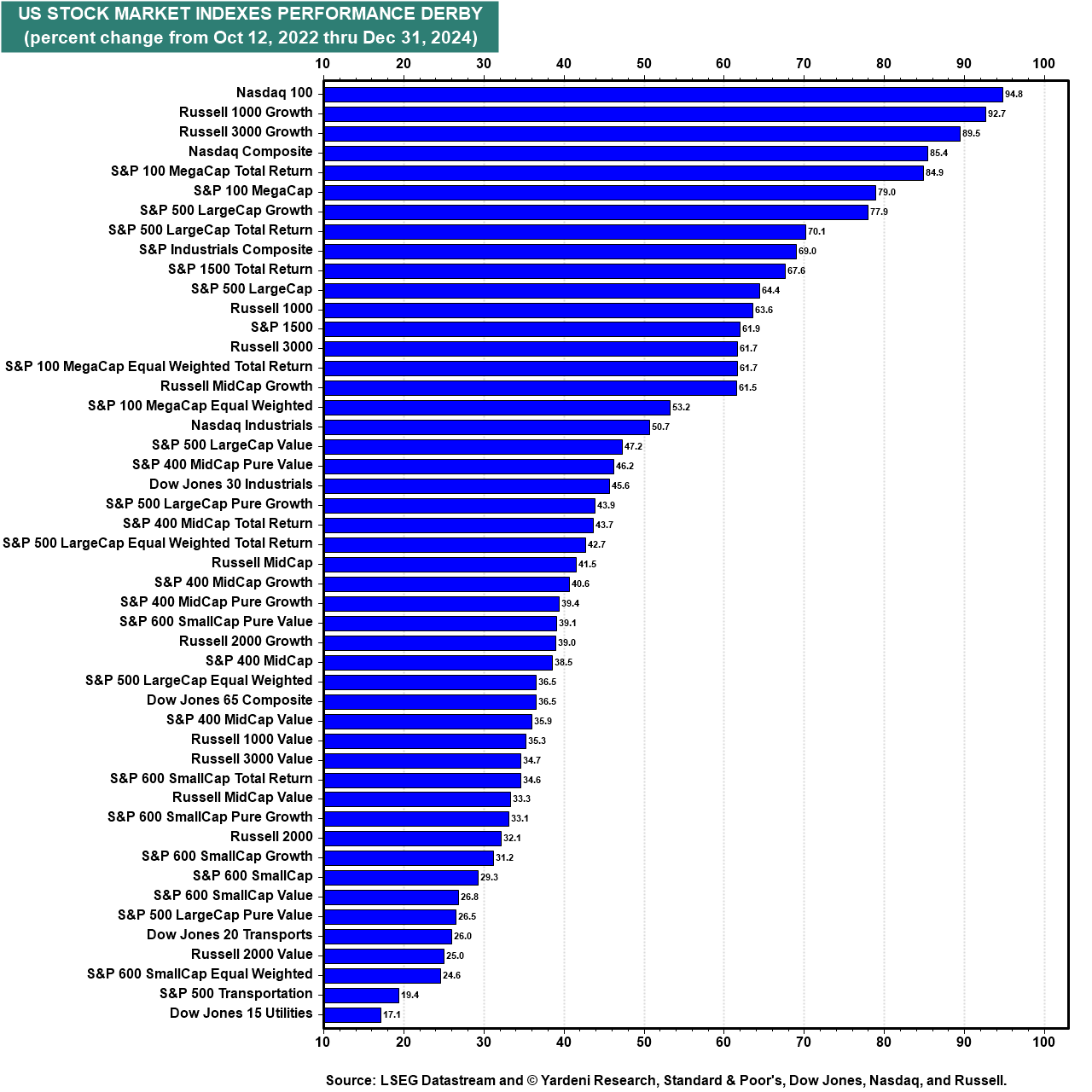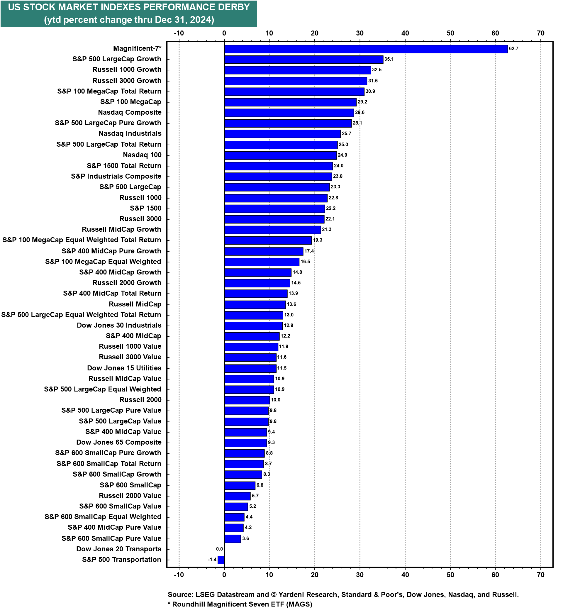(1) Last year's advance was heavily skewed by the Magnificent-7 stocks, which collectively soared 62.7% and currently account for a whopping 32% of the market cap of the S&P 500 (chart). They will probably continue to outperform at the start of the year. We also think that the Nasdaq will outperform in 2025. While we believe a significant stock market pullback is likely at the start of the new year, we expect the bull market to broaden again starting in the spring, once monetary and fiscal policies become clearer.