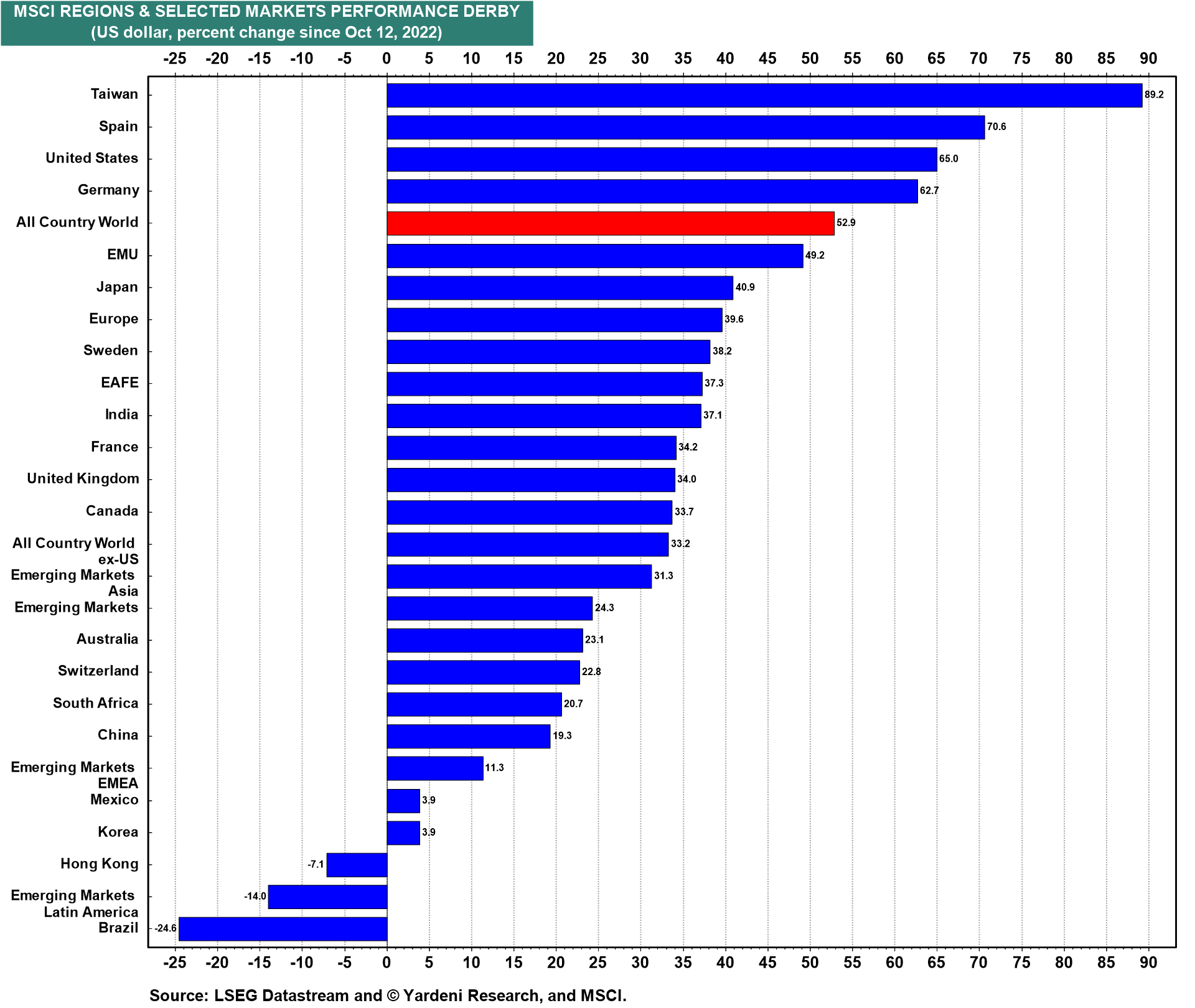 (3) The bull market since October 12, 2022 has been a broad one, with plenty of stock market indexes up by more than 25% (chart). It only seems narrow because of the significant outperformance of a handful of large-cap stocks.
