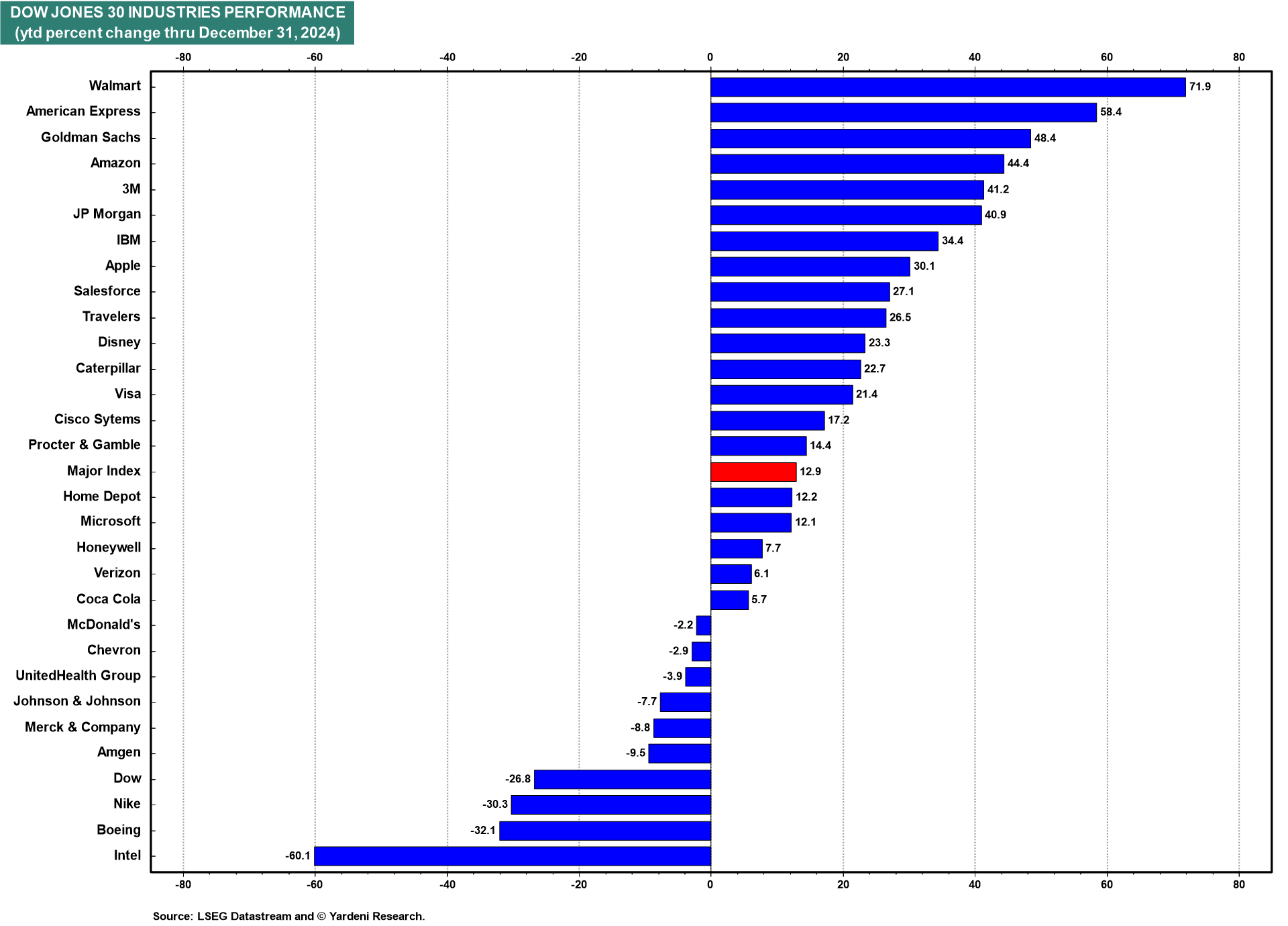 (6) Finally, we wouldn’t be surprised if the Dogs of the Dow in 2024 remain so in 2025, weighing on the relative performance of the index (chart).