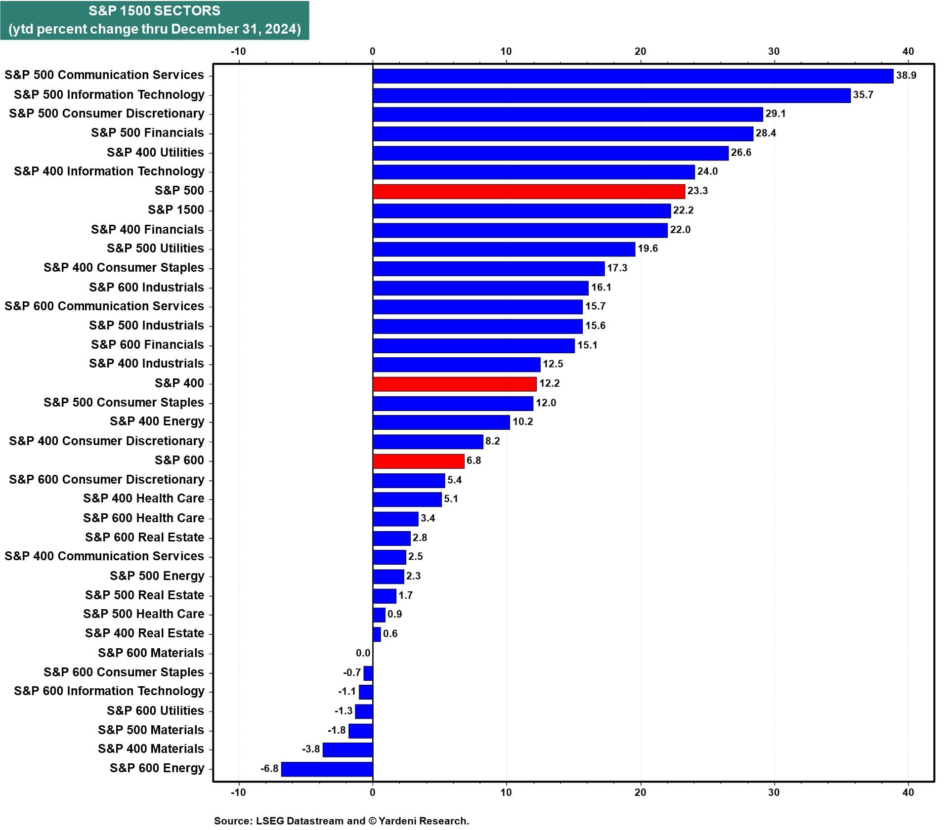 (2) In 2024, the S&P 1500's outperforming stock sectors were dominated by large-cap growth stocks, particularly the Mag-7 (chart). However, the S&P 500 Financials and S&P 400 Utilities managed to beat the S&P 500. We aren't keen on small caps, which have been disappointing underperformers for several years now. The problem is that the best of the bunch get acquired before they can grow into the next Microsoft. Furthermore, the forward earnings of the S&P 400 and S&P 600 have been flat-lining since 2022.