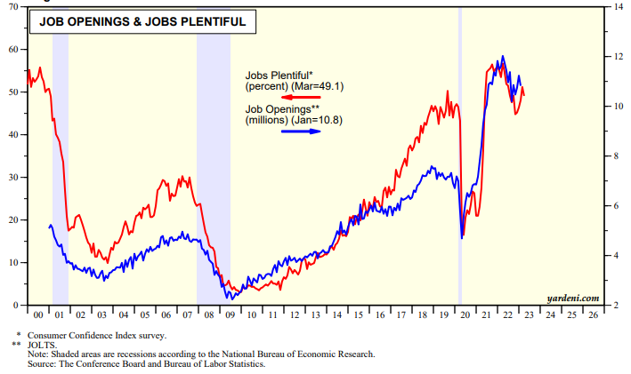 (1) Consumer confidence. The labor market remains strong according to the March survey of consumer confidence conducted by the Conference Board. The “jobs hard to get” response remained very low at only 10.3%, while the “jobs plentiful” response edged down to 49.1%, which is historically high. The former is highly correlated with the unemployment rate, while the latter is highly correlated with the JOLTS job openings series (chart).