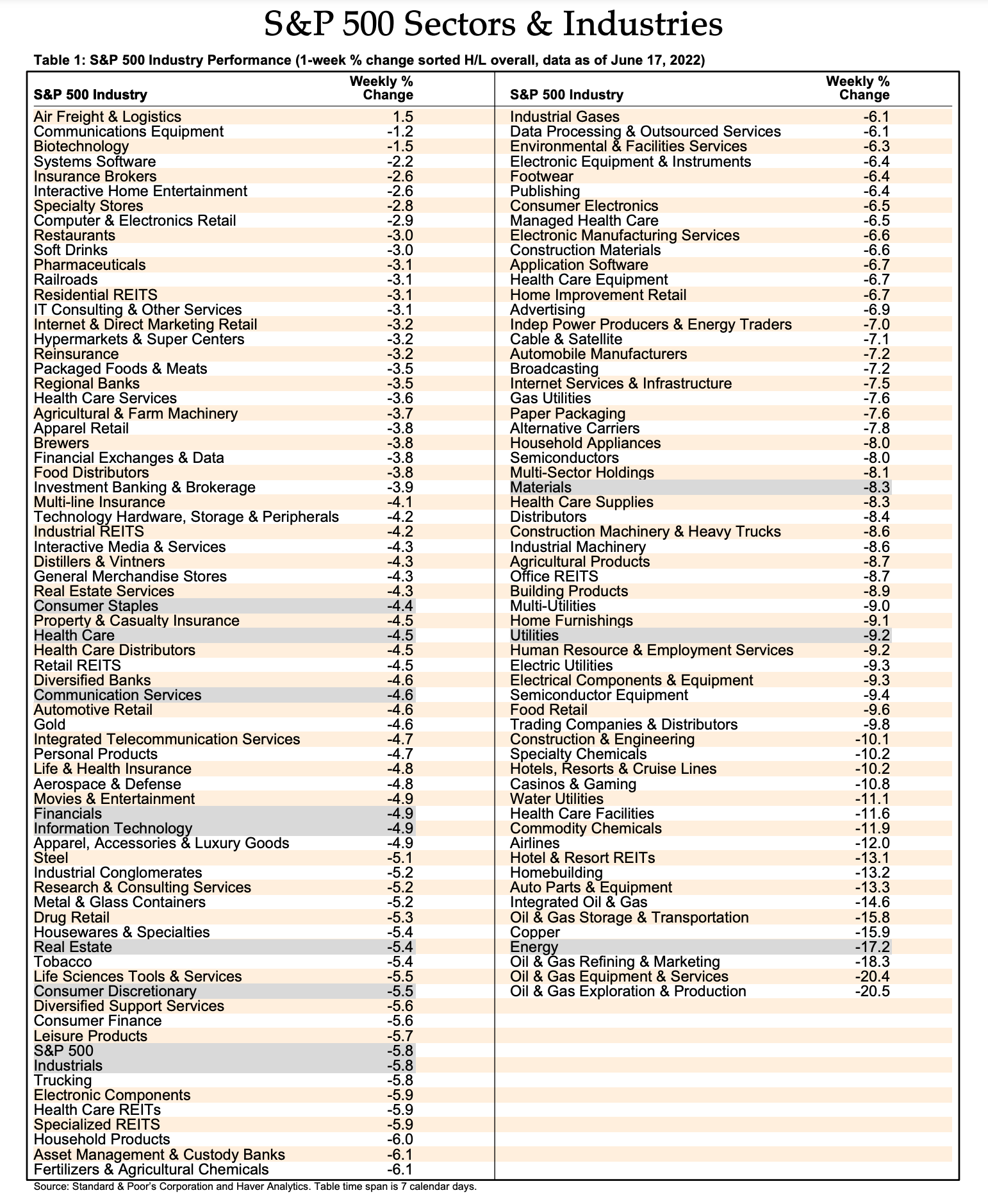 This was one of the worst weeks in one of the worst years, so far, for the stock market. Of the 100+ industries that we track in the S&P 500, only one was up, namely, Air Freight & Logistics. All the rest were down with more than half exceeding the 5.8% decline of the S&P 500.