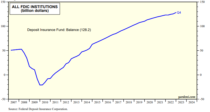 The FDIC estimated that SVB’s failure will cost its Deposit Insurance Fund (DIF) around $20 billion, with the exact amount to be determined once the receivership is terminated. The DIF had a balance of $128.2 billion at the end of last year (chart).