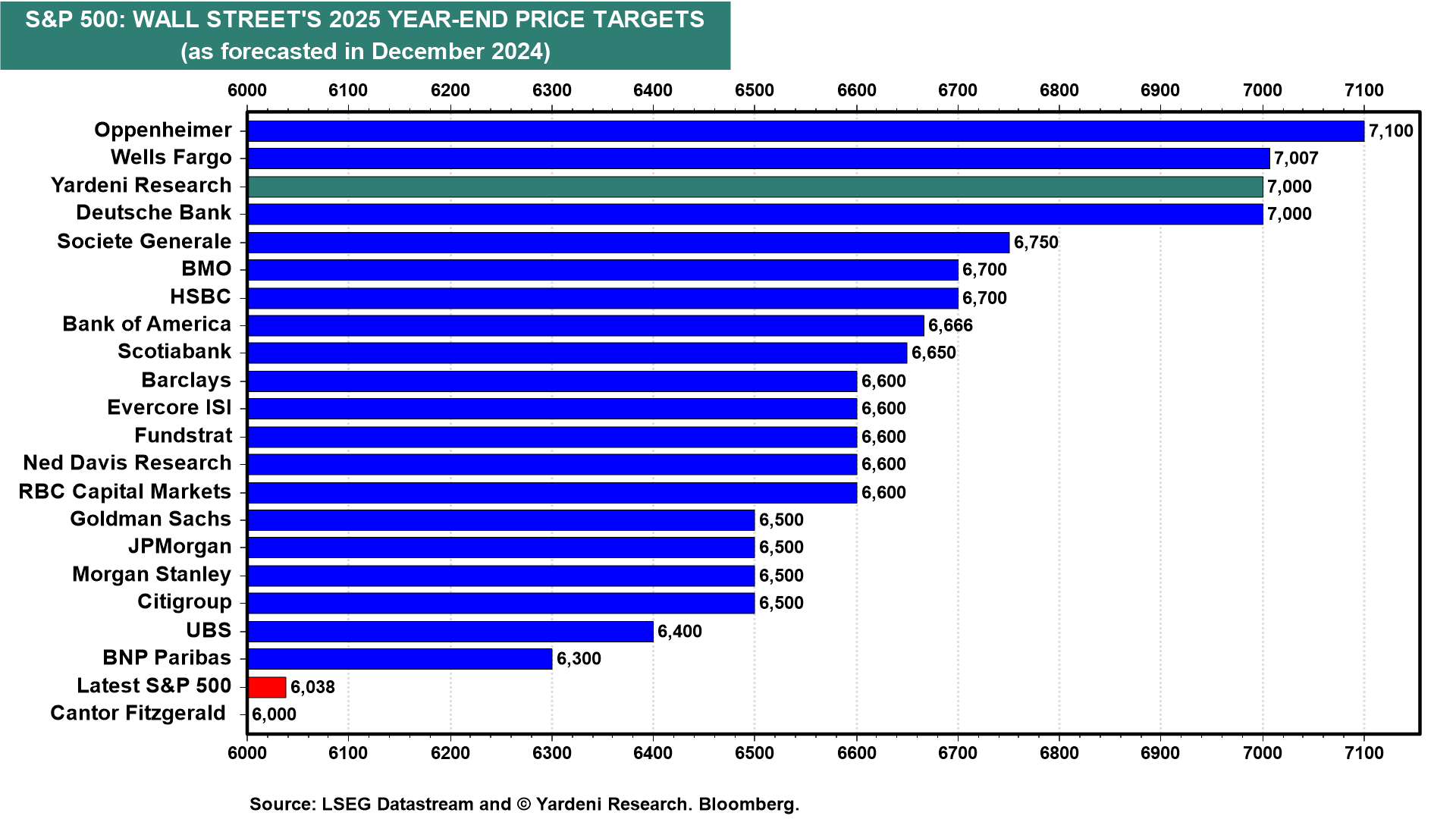 We've been bullish on the stock market since October 2022. We remain bullish, targeting 7000 on the S&P 500 by the end of next year. That puts us near the head of the pack (chart).
