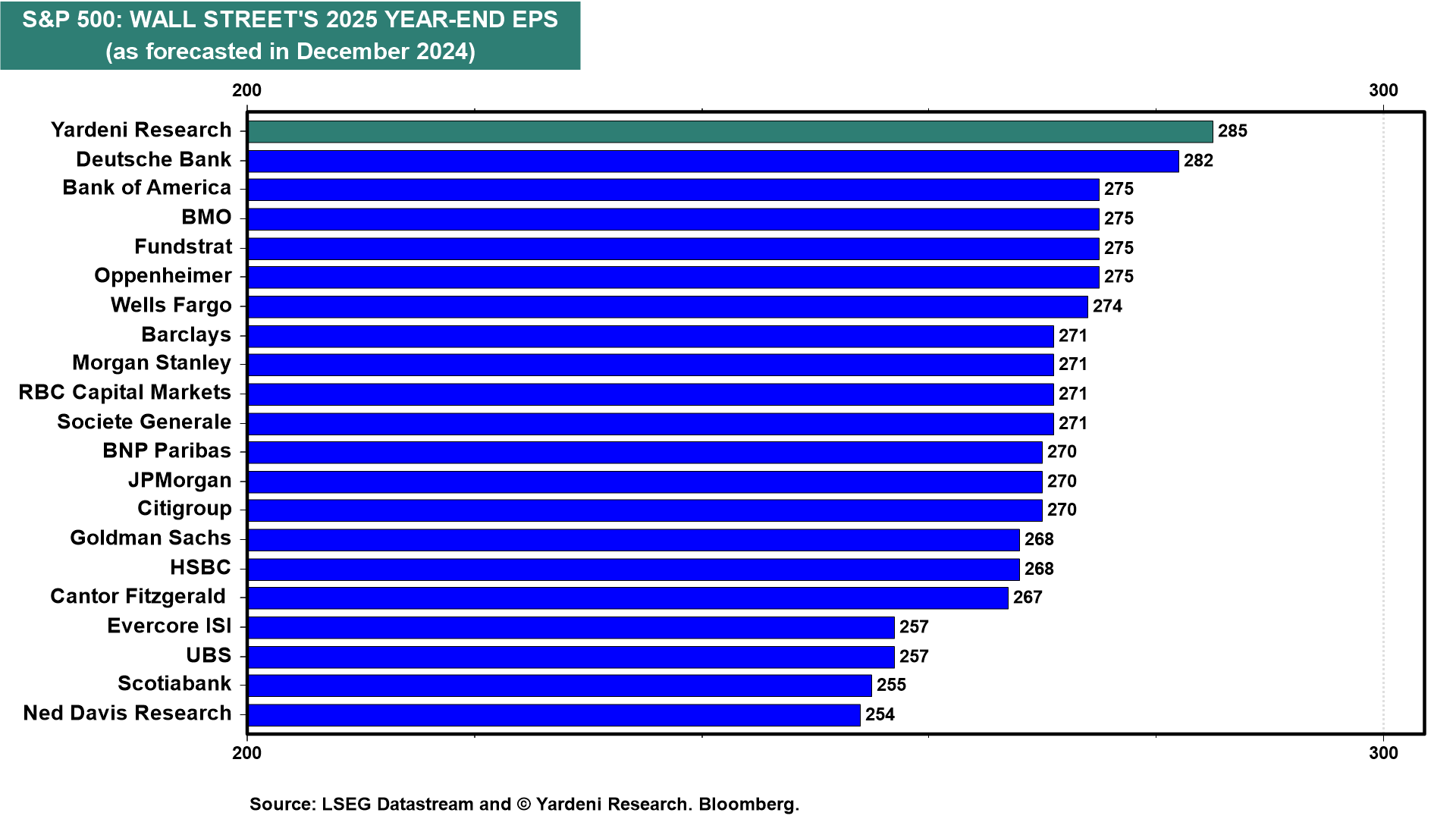 (1) Our forecast for revenues, earnings & margins. We are the head of the pack on the outlook for S&P 500 operating earnings per share next year at $285, up 18.8% y/y (chart). That's consistent with our productivity-led Roaring 2020s scenario for 2025 with real GDP rising 3.0%-3.5%, while inflation remains subdued around 2.5%. In our 2025 outlook, S&P 500 revenues per share should rise 5.1% to $2050 as the profit margin rises to a record 13.9%.