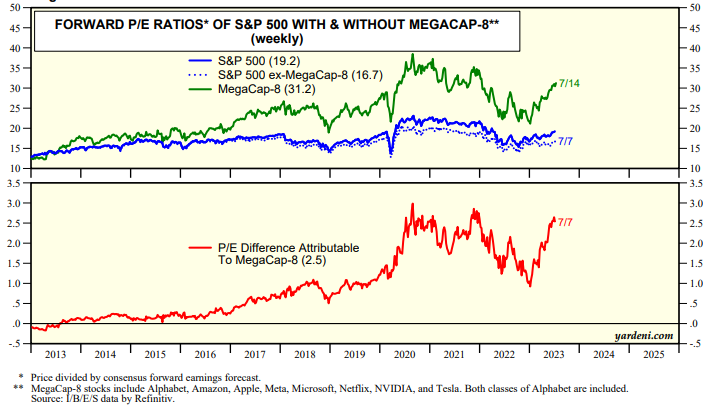 In the Brave New World of AI, investors seem to be willing to pay a higher valuation multiple for earnings, especially of the MegaCap-8. Could it be that the historical fair-value P/E of 15.0 is history? It might be in the Roaring 2020s dominated by the MegaCap-8, which currently account for a record 27% of the market cap of the S&P 500 and sport a 31.2 forward P/E (chart). The S&P 500's forward P/E with and without them is 19.2 and 16.7.