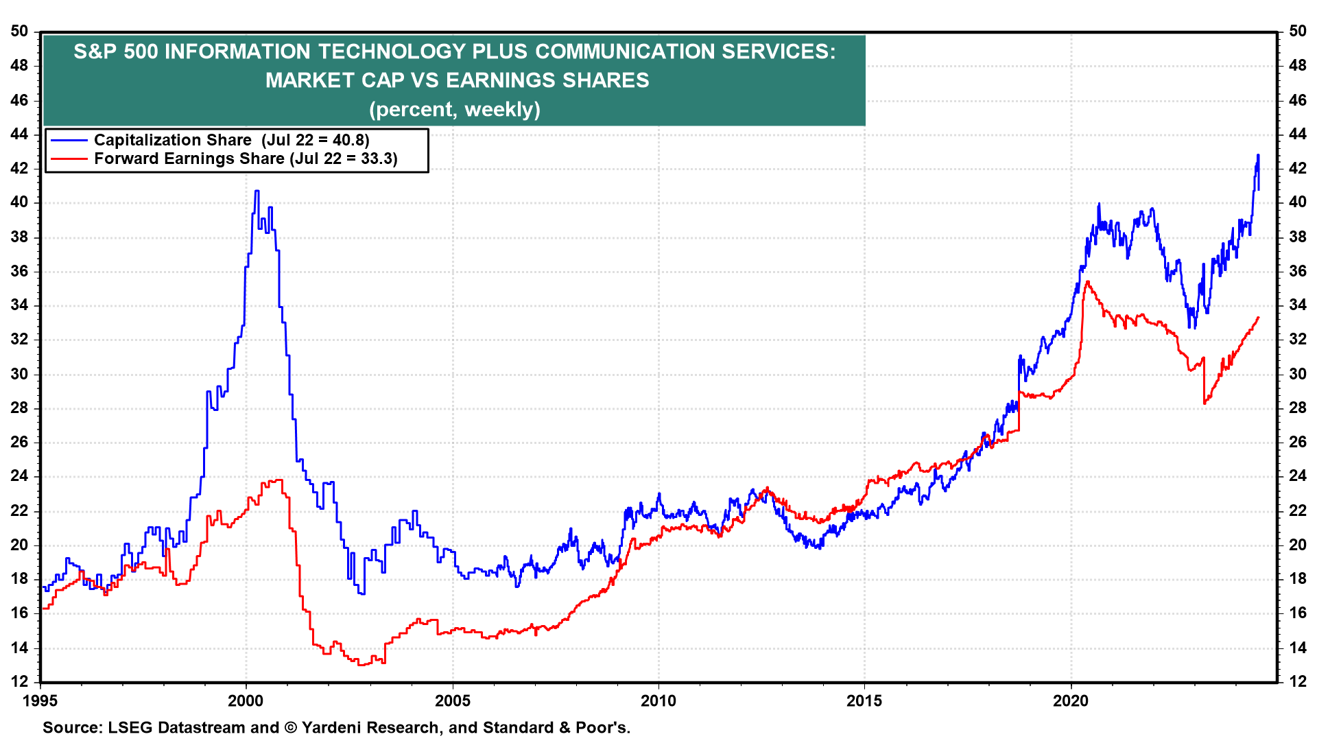 For example, while the combined market cap of the S&P 500 Information Technology and Communication Services sectors comprise 41% of the S&P 500, matching the 2000 peak, the two sectors currently represent a third of the S&P 500's forward earnings, versus less than a quarter in 2000 (chart).