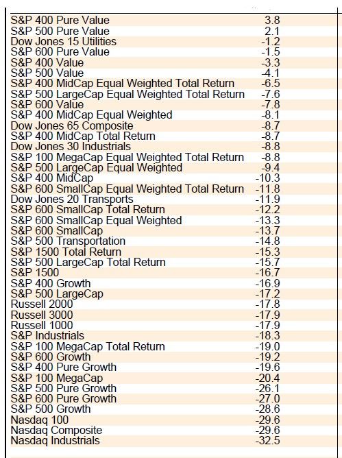 The S&P 500 LargeCap index is down 17.2% since last year's peak. The total return index is down 15.7%. The LargeCap equal-weighted index is down 9.4%. The LargeCap equal-weighted total return index is down 7.6%. Diversification and dividends cushioned the downside.