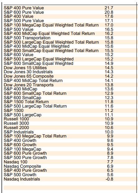 Below is the same performance derby table since last year's bear market low. While the S&P 500 is up 11.1%, the total return index is up 11.6%, the equal-weighted index is up 15.2%, and the equal-weighted total return index is up 15.8%.