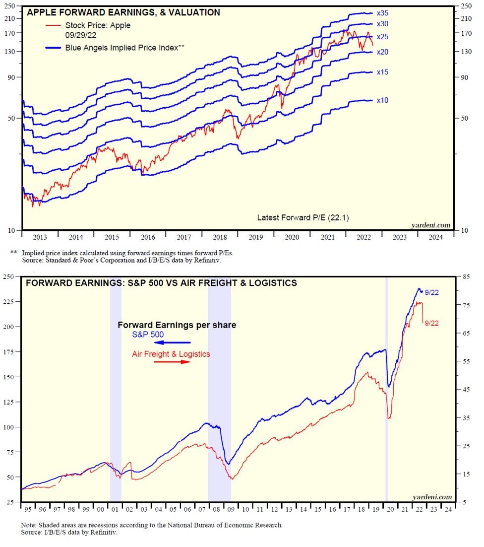 (2) The latest stock market selloff started after FedEx’s recent warning. The package delivery giant delivered a terrible preannouncement about its fiscal Q1 (ended August) on Thursday evening, September 15. FedEx said that it expects Q1 earnings, excluding some items, to be roughly 33% below the analysts’ consensus estimate. It also withdrew its earnings forecast for 2023, saying that macroeconomic trends have “significantly worsened,” both internationally and in the US, and are likely to deteriorate further. That heightened fears of a broad-based earnings decline (chart).