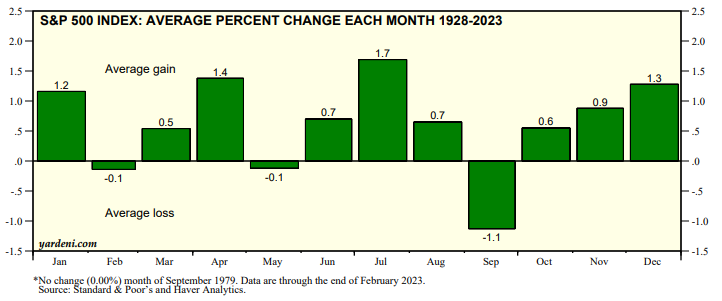 April is the second best month of the year for the stock market. From 1928 through 2022, the S&P 500 was up 1.4% on average during the month, second only to July's 1.7% average gain (chart).