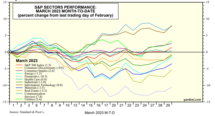 The S&P 500 is up 1.5% since the end of February through today (chart). That's impressive given that Silicon Valley Bank imploded on Friday, March 10. As a result, the S&P 500 Financials sector is down 10.5% in March. Usually, the stock market tends to do poorly when the Financials sector is in distress. This time so far, four of the sectors are up in March led by Information Technology (8.0%) and Communication Services (7.8) (chart).