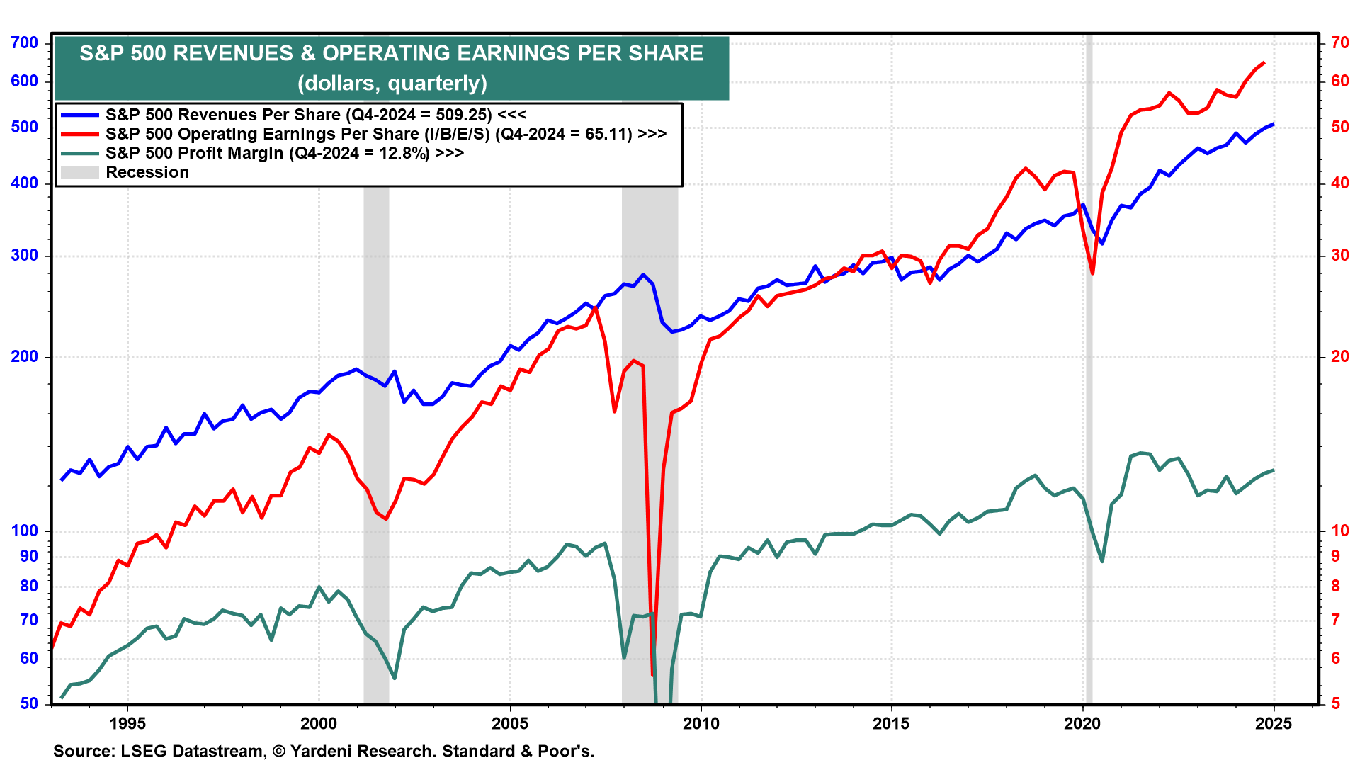 If the economic data up ahead confirm our upbeat assessment of the economy, then earnings should increasingly drive the stock market higher. Our colleague Joe Abbott reports that complete Q4-2024 data are now available for S&P 500 companies’ aggregate revenues per share (RPS), earnings per share (EPS), and profit margin.