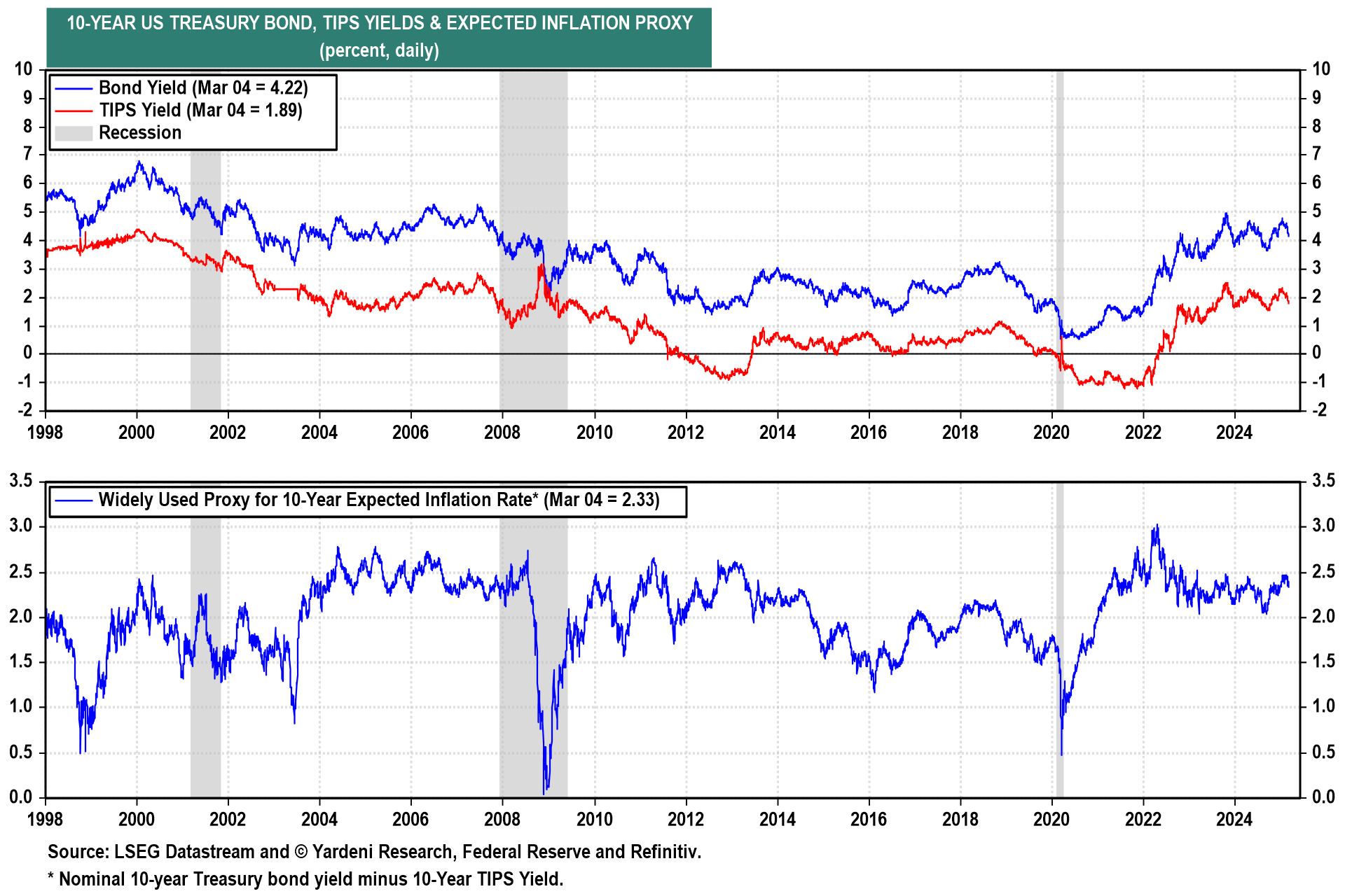 We've been forecasting that the 10-year US Treasury bond yield should range between 4.25% and 4.75% this year (chart). It fell slightly below that range in recent days during the tariff turmoil. Now it is back at 4.28%. The comparable TIPS yield has fallen recently on weaker-than-expected US economic data.