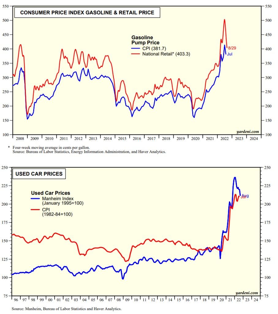 August's CPI report will be released on September 13. It is likely to show that inflation is continuing to moderate. We know that the pump price of gasoline fell sharply this month (chart below). We also know that the wholesale price of used cars fell during August, suggesting that the CPI for used cars fell this month (chart below).