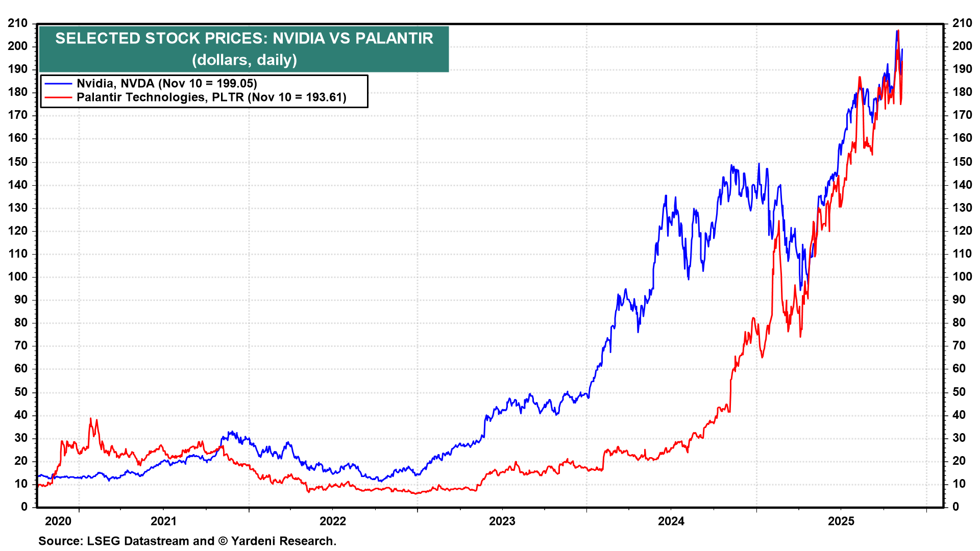 Today was not a good day to be short AI stocks like Nvidia (up 5.8%) and Palantir (8.8%). They both rebounded dramatically, along with other AI stocks following last week's selloff (chart). Investors and traders bought the dip again. It's hard to short stocks in a bull market. The Magnificent-7 rose 2.8% today after falling 3.4% last week.