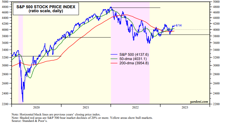 We've previously observed that any day without a banking crisis is a good day for stocks. SVB imploded on Friday, March 10. On Sunday, March 12, the Fed and FDIC took actions to avoid additional bank runs. The S&P 500 is up 7.1% since March 10 led by Information Technology (9.8%), Health Care (8.6), and Utilities (7.6%) (chart). All of the sectors are up since then including even the Financials (0.1).