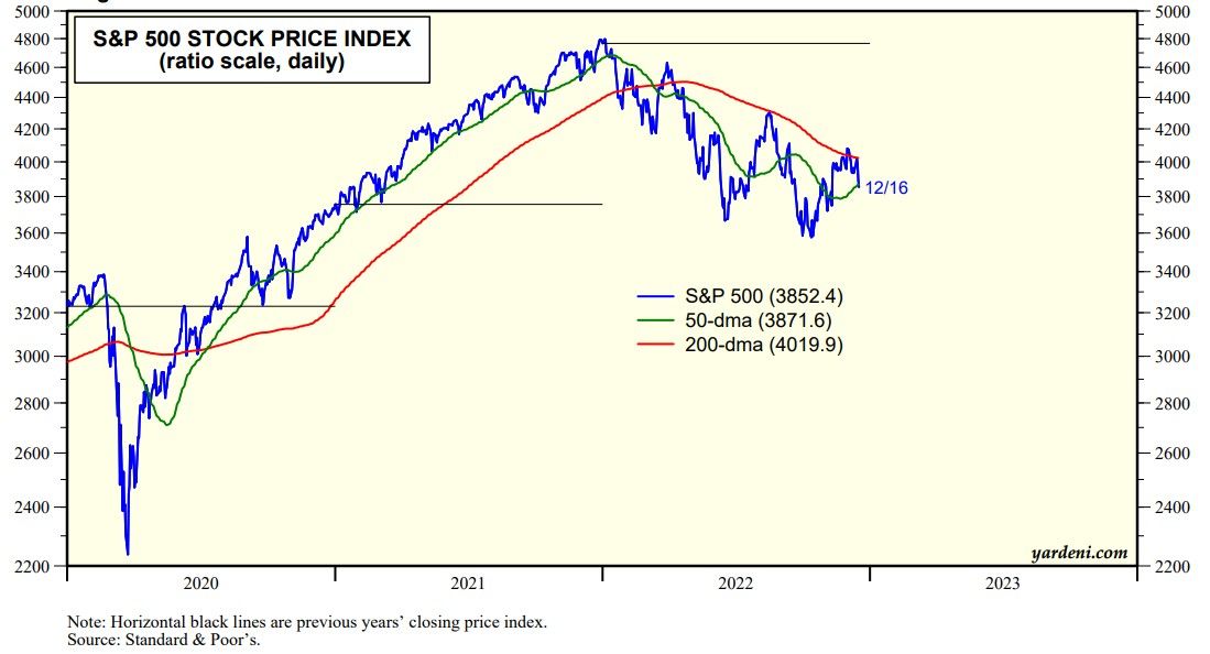 The index has made three major lower highs off its 200-day moving average and two major lower lows since January 3. It closed below its 50-day moving average on Friday (chart). The bears are expecting new lows in early 2023. We are expecting the October 12 low to hold if it is tested.