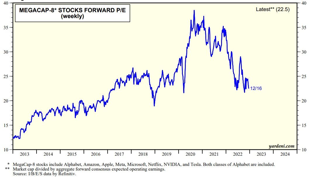 A persistently hawkish Fed continues to beat the stock market down. And so does bad news from the MegaCap-8. The air continues to come out of their valuation multiples (chart). Its forward P/E is down from around 35 at the start of the year to 22.5 on Friday.