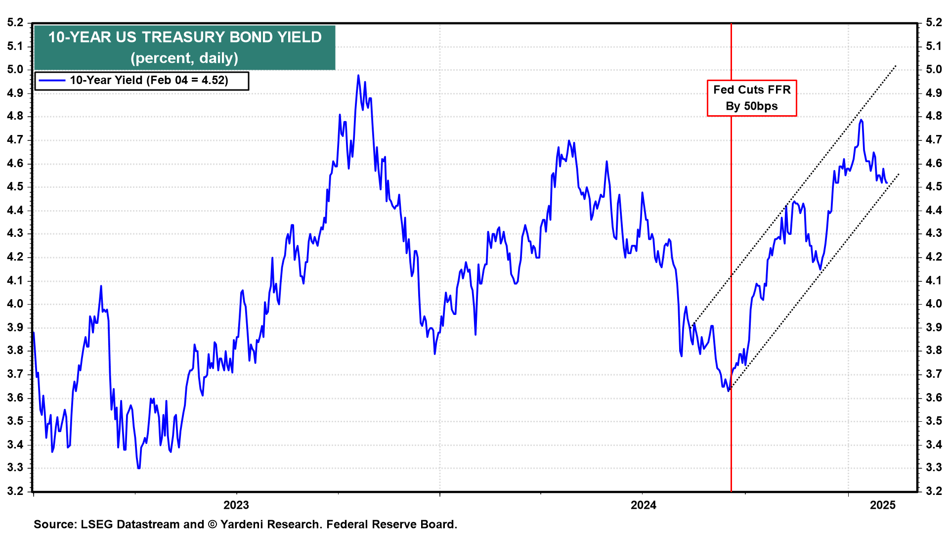 The bond market relaxed today after Treasury Secretary Scott Bessent's debut Quarterly Refunding Announcement (QRA) proved to be a non-event. The 10-year Treasury yield fell 9bps to 4.43%, its lowest level since the Federal Reserve's last rate cut, in mid-December (chart).