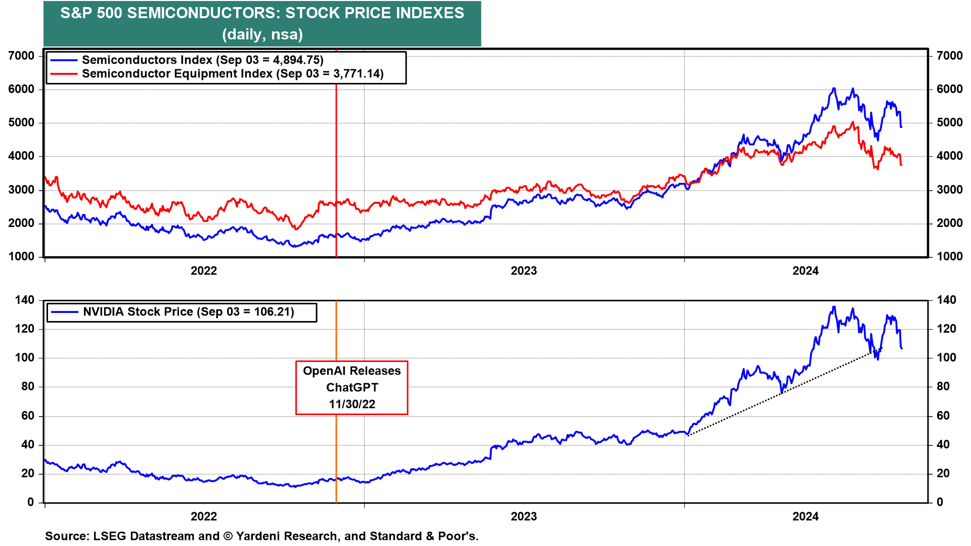 (1) Nvidia. We suspect that the DOJ's subpoena leaked over the long weekend. Nvidia fell 11% on Tuesday despite the news breaking after the market closed. Nvidia's freefall caused other semiconductor stocks to drop (chart).