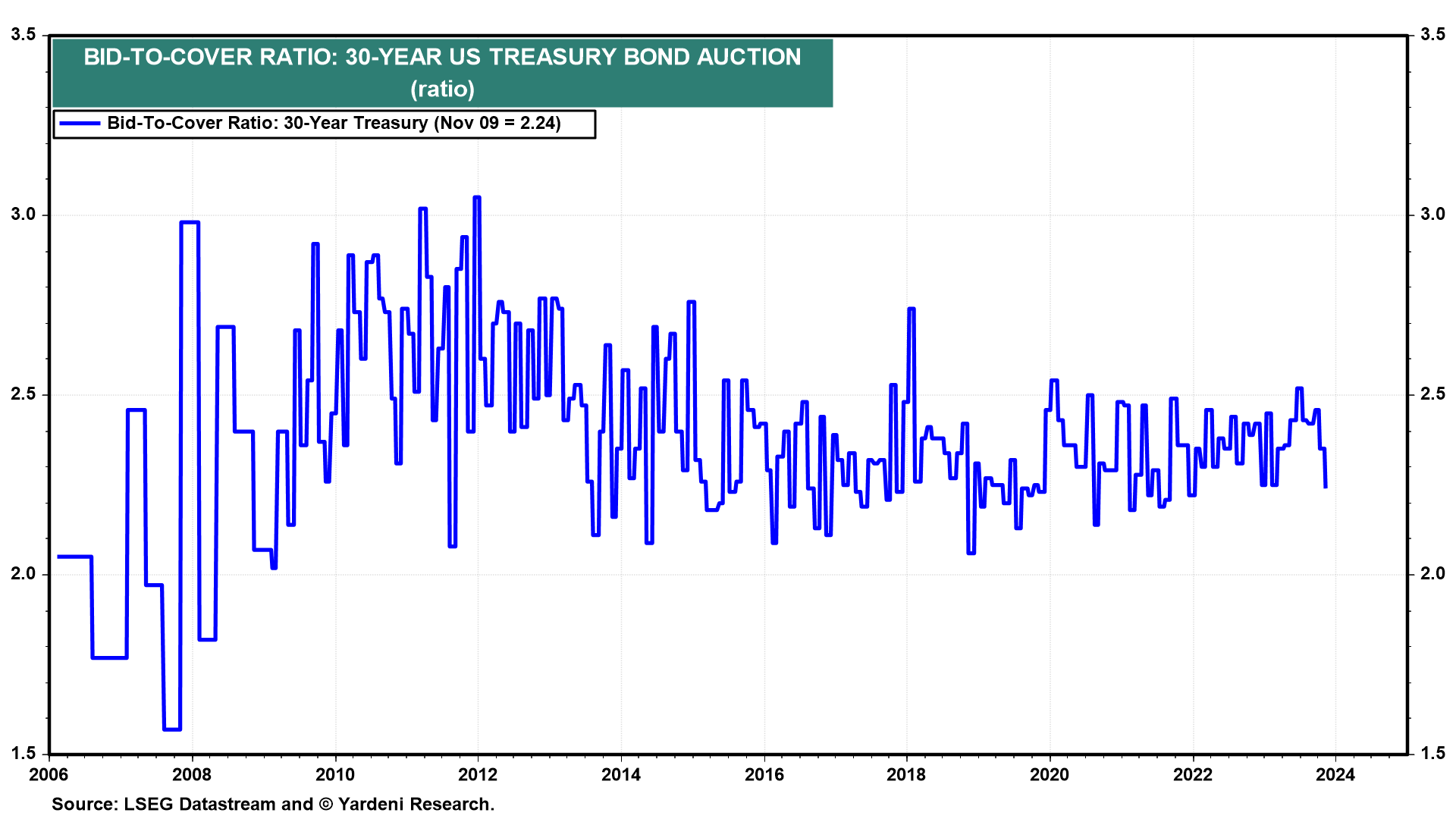 The bid-to-cover ratio is the dollar value of bids compared with the dollar value of debt offered. Falling bid-to-cover ratios indicate less robust interest from investors. Yields climbed today after a weak auction of $24 billion in 30-year Treasuries with demand for the debt at 2.24 times the bonds on sale (chart).