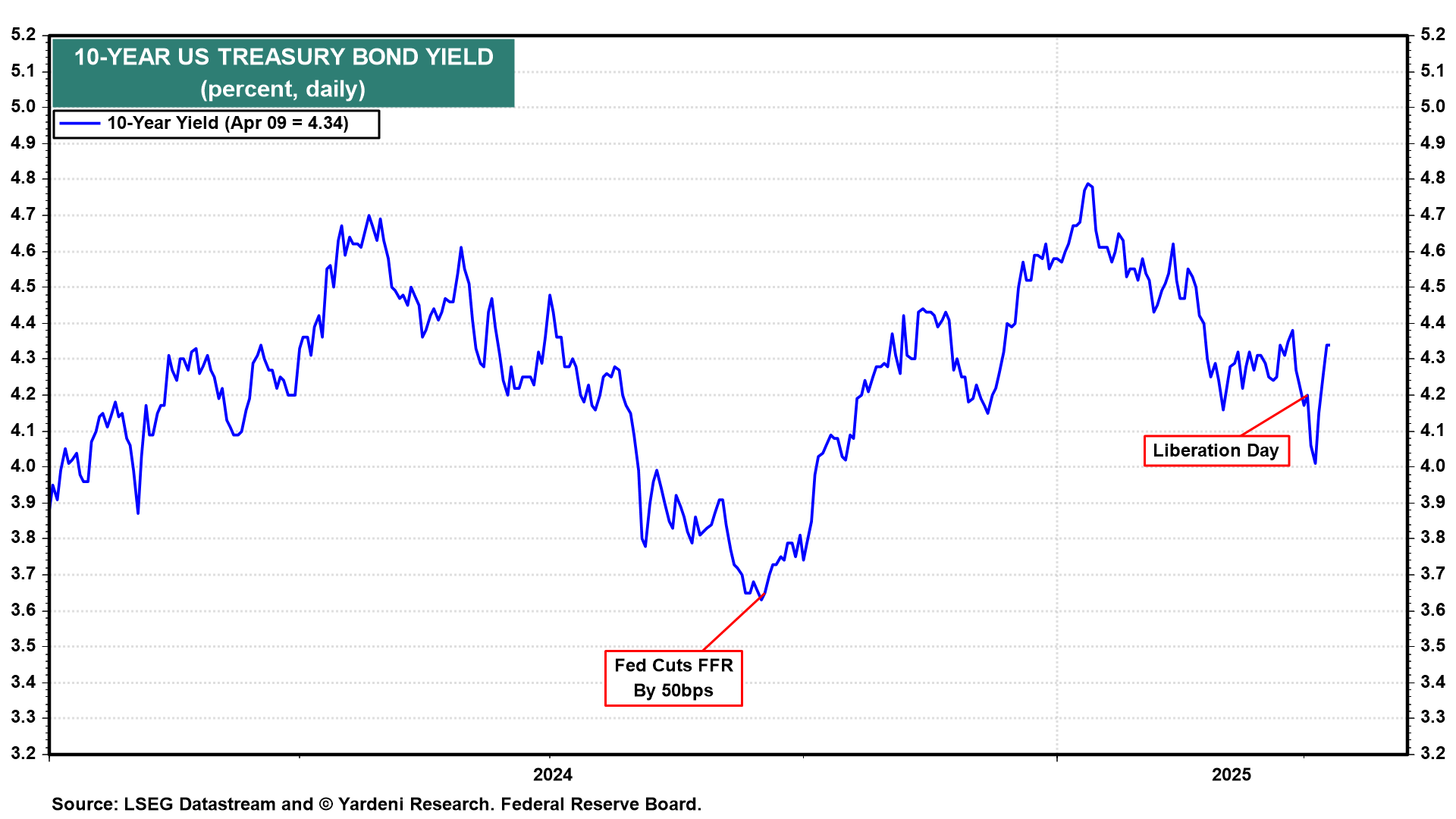 The Bond Vigilantes have struck again. As far as we can tell, at least with respect to US financial markets, they are the only 1.000 hitters in history. Even though the Stock Vigilantes were clearly telling President Donald Trump that his tariff policy was misguided late last week, his advisers touted falling oil prices and bond yields as ultimately helping Main Street America. That changed as the 10-year Treasury yield surged 34 bps from below 4.0% on Friday to nearly 4.34% today (chart).