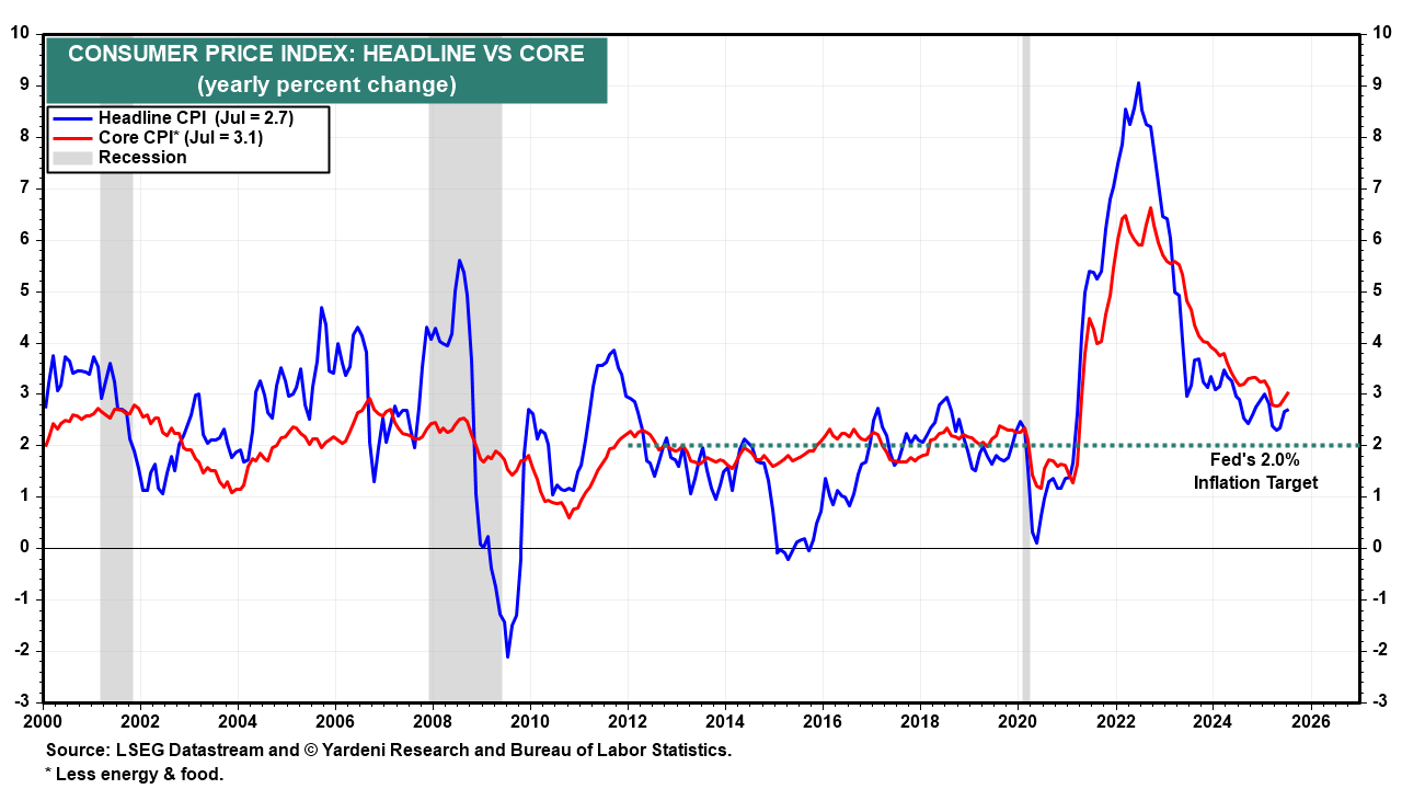 The S&P 500 and Nasdaq jumped to new record highs following the release of July's CPI report today. The headline inflation rate held steady at 2.7%, while the core rate warmed a bit to 3.1%. Stock investors concluded that the Fed is even more likely to ease in September. Indeed, the CME FedWatch tool now shows that the odds of that happening are 94.4%. The 10-year US Treasury bond yield, however, edged up to 4.30%.