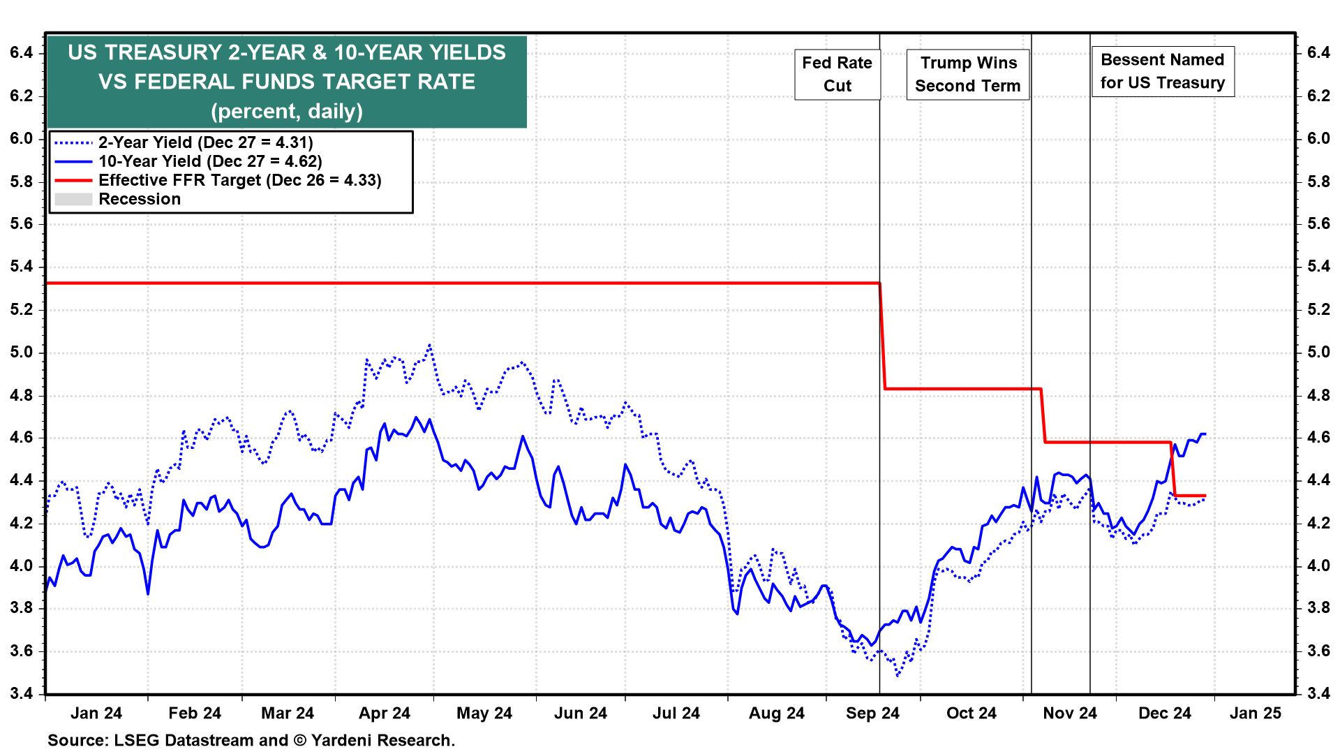 The 10-year Treasury bond yield is up 100bps since the Fed started lowering the federal funds rate (FFR) by 100bps on September 18 (chart). Even the 2-year Treasury yield is up about 75bps. We warned about this happening back in August. The Bond Vigilantes are sending a loud warning message. They aren't convinced Donald Trump, the new sheriff coming to town, will maintain fiscal law and order any better than the old sheriff. They are also losing their confidence in Jerome Powell, the deputy in charge of monetary law and order.