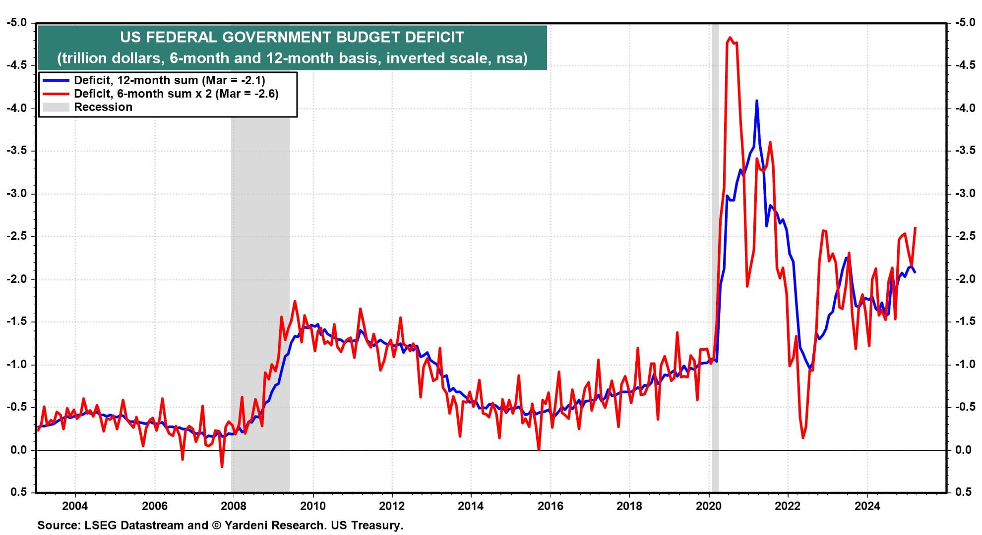 Bond Market. The 10-year Treasury bond yield rose to 4.45% this evening, up from a recent low of 4.01% on April 4, two days after Liberation Day. Yesterday, President Donald Trump partially postponed Liberation Day because the bond market was "tricky." It remained tricky today. Yields rose even though the March CPI inflation rate reported this morning was lower than expected. The Treasury reported today that the federal budget deficit totaled $2.1 trillion over the past 12 months (chart). It was $2.6 trillion over the past six months at an annual rate.
