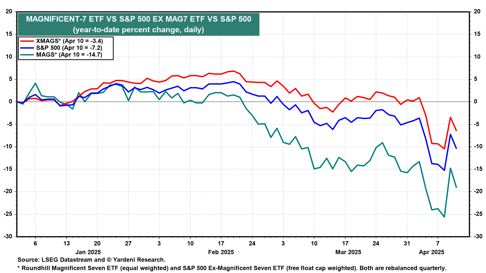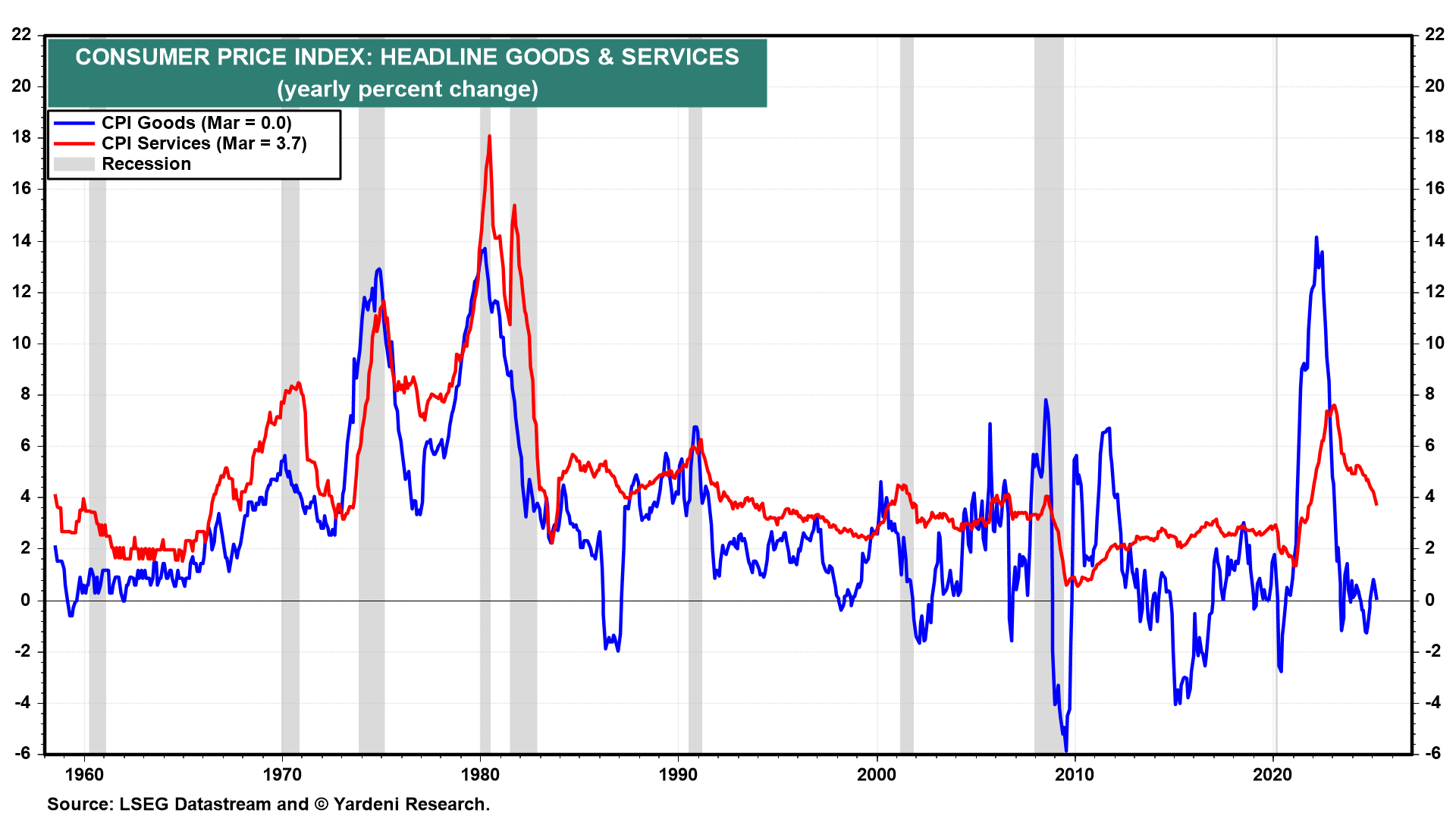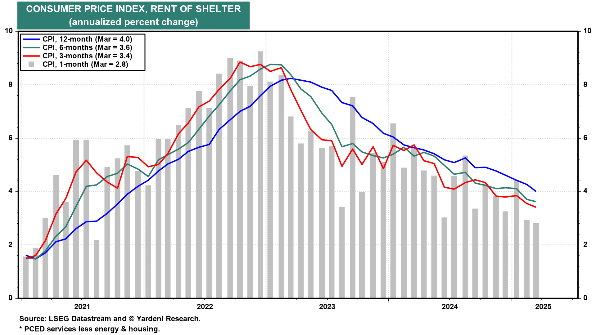 (1) Inflation. Today brought good news on inflation, as the March CPI fell 0.1% m/m (the first monthly deflation since 2020) and rose 2.4% y/y. Falling gasoline and airfare prices weighed on the index. Core CPI inflation rose 0.1% m/m and 2.8% y/y. In April, falling gasoline prices may continue to weigh on goods inflation, while services prices continue to disinflate (chart). By May and June, inflation is likely to be boosted by Trump's tariffs.
