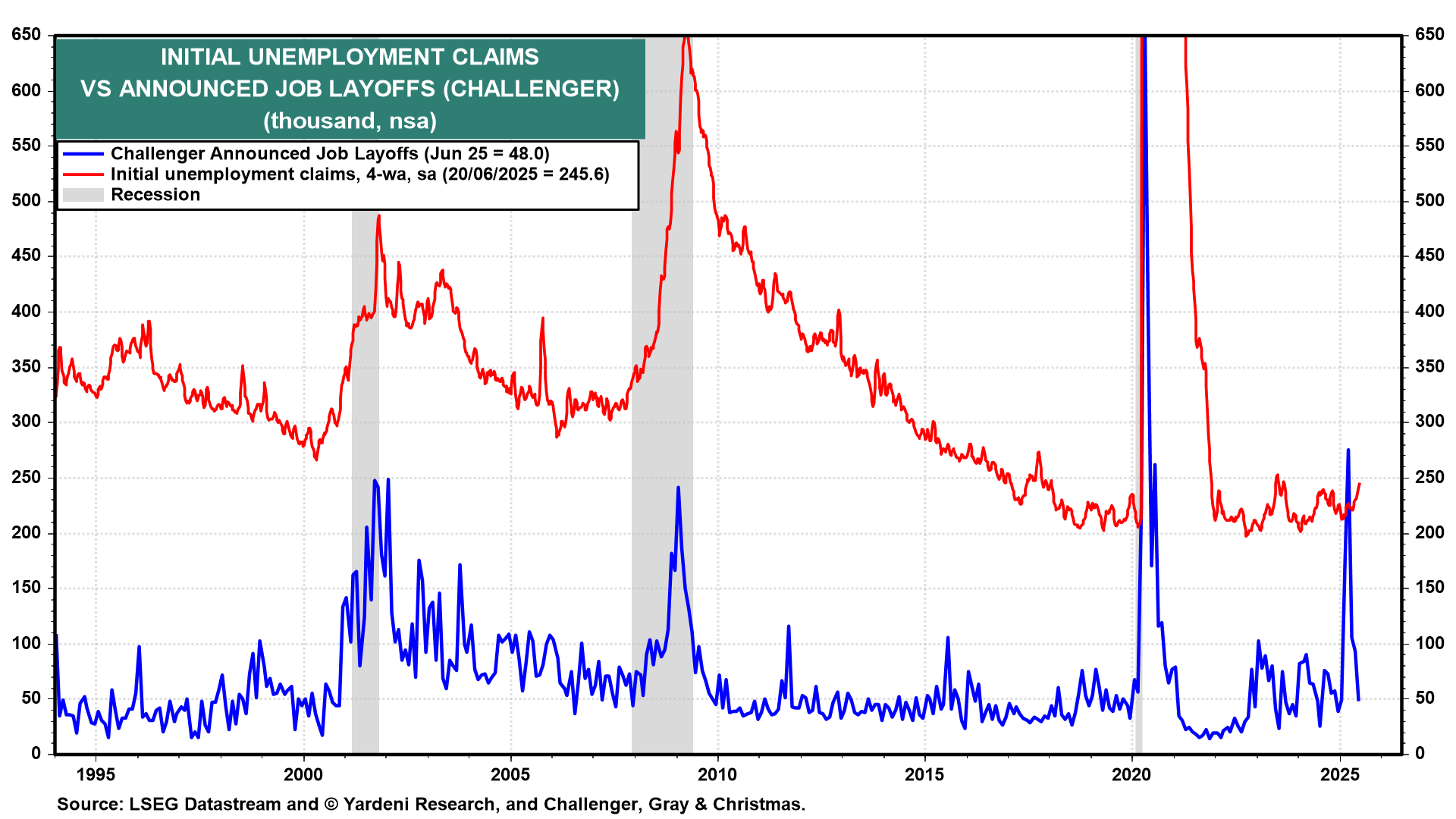 (2) Challenger layoffs. A separate report from global outplacement firm Challenger, Gray & Christmas showed job cuts announced by US-based employers totaled 47,999 in June, a drop of 49% from the prior month (chart).