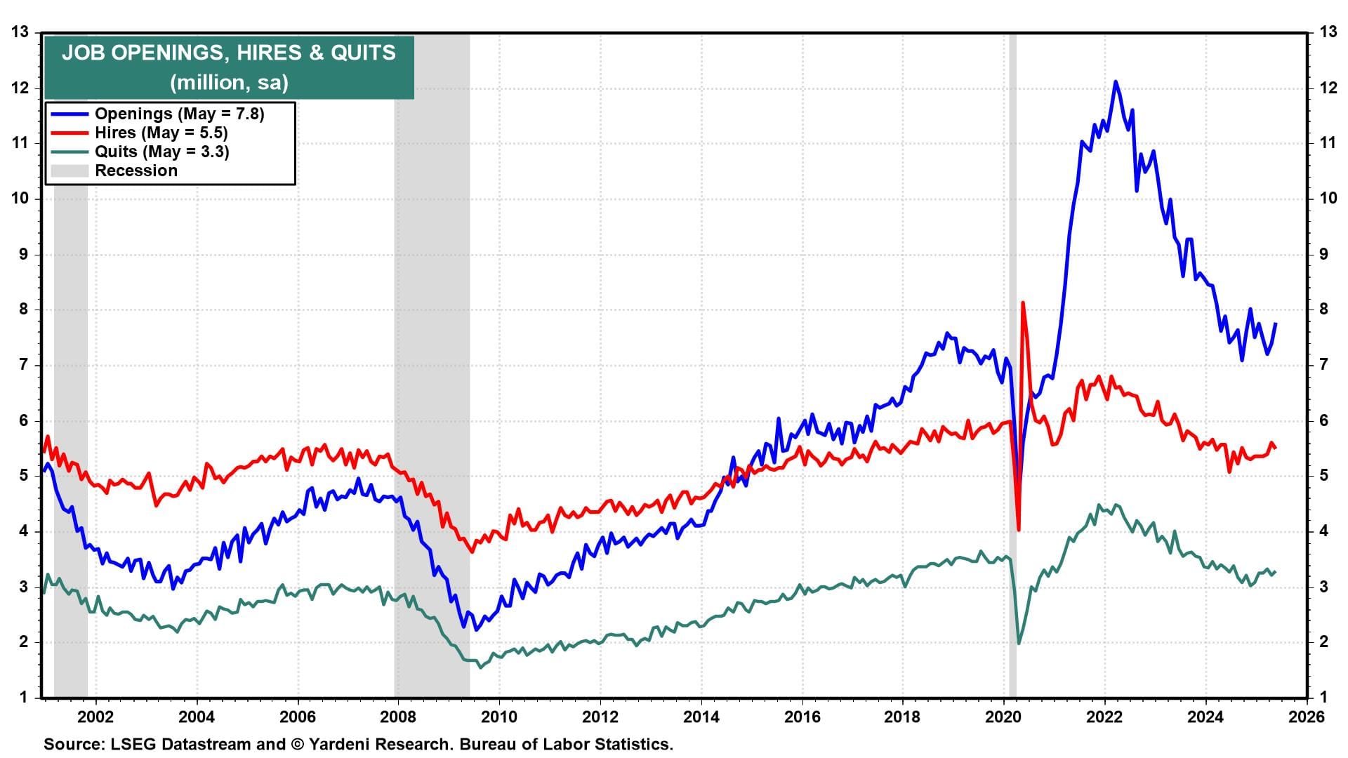 (3) JOLTS. Hiring remained relatively robust in May, according to the JOLTS report (chart). It showed hires at 5.503 million in May, a slight decline of 112,000. Job openings increased so that there were 1.07 job openings for every unemployed person in May, up from 1.03 in April.