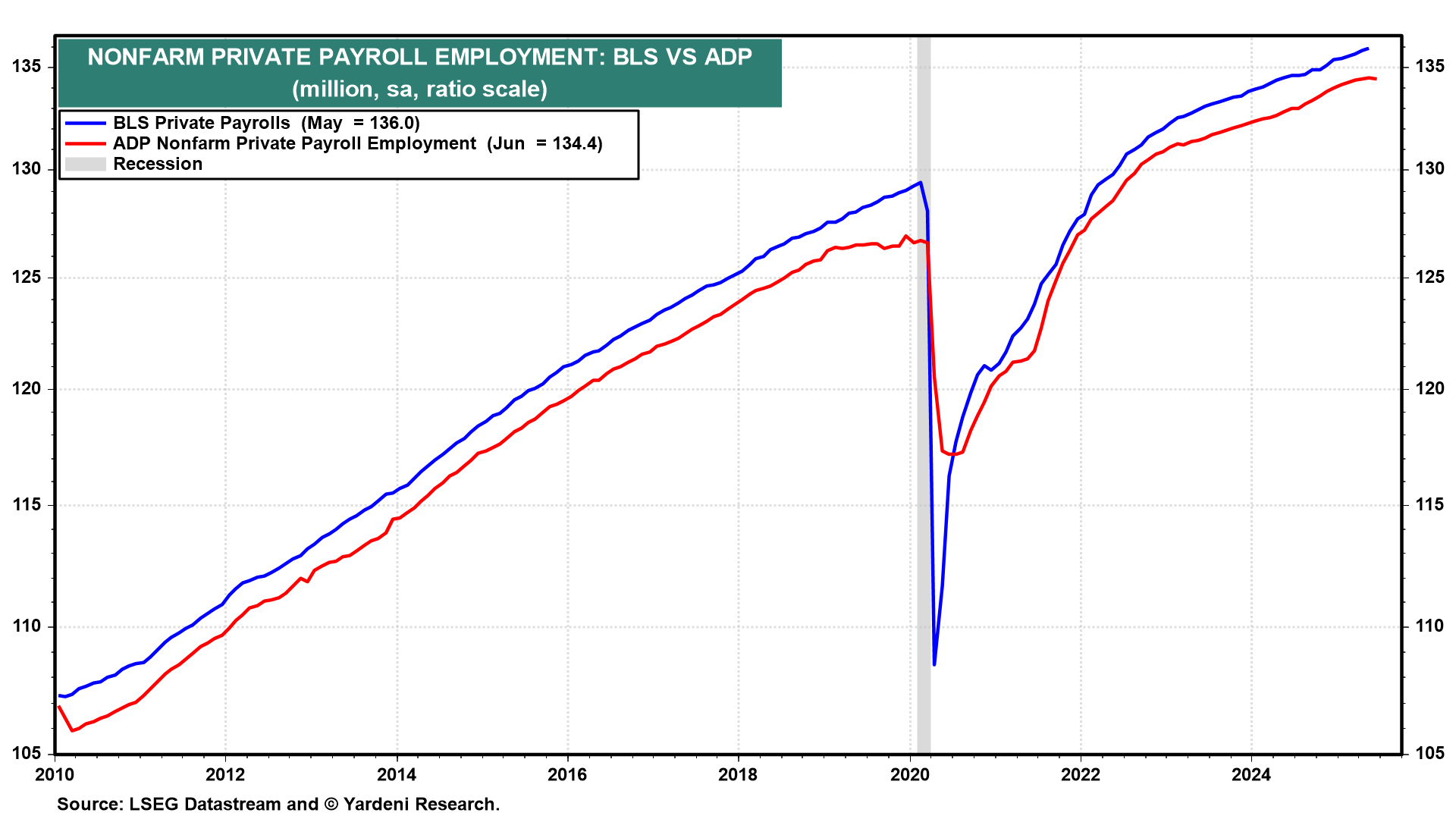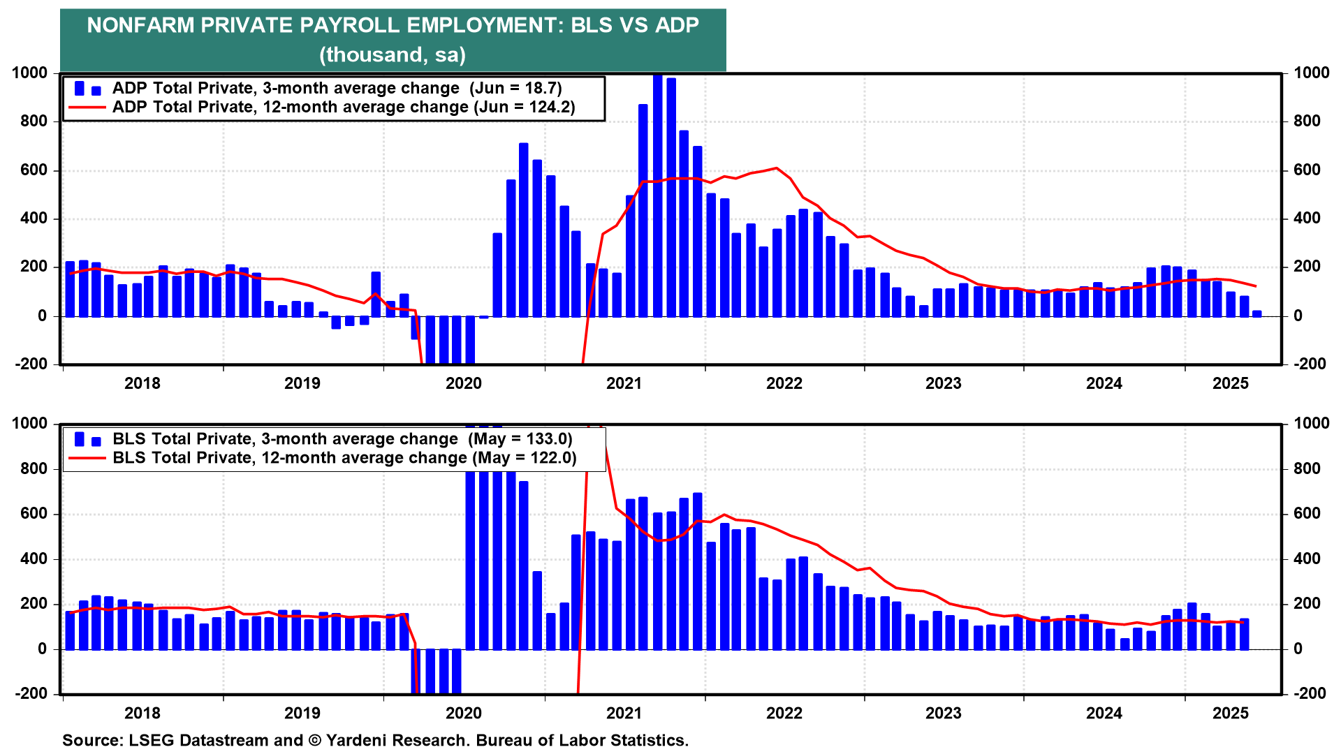 (1) ADP. The ADP measure of private industry payrolls has been a misleading indicator of the comparable data compiled by the Bureau of Labor Statistics (BLS) in recent months (chart). We aren't sure why that's happened.