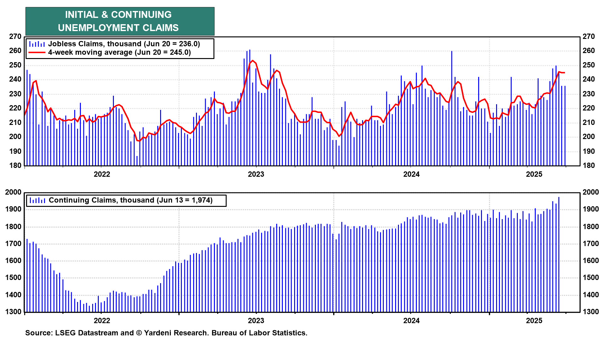 (4) Unemployment claims. The low readings for initial unemployment claims in recent weeks confirm the drop in Challenger's layoffs series. However, the rise in continuing claims indicates that it is taking longer to get a job. This suggests that the unemployment rate might have edged up slightly in June to 4.3% from 4.2%.