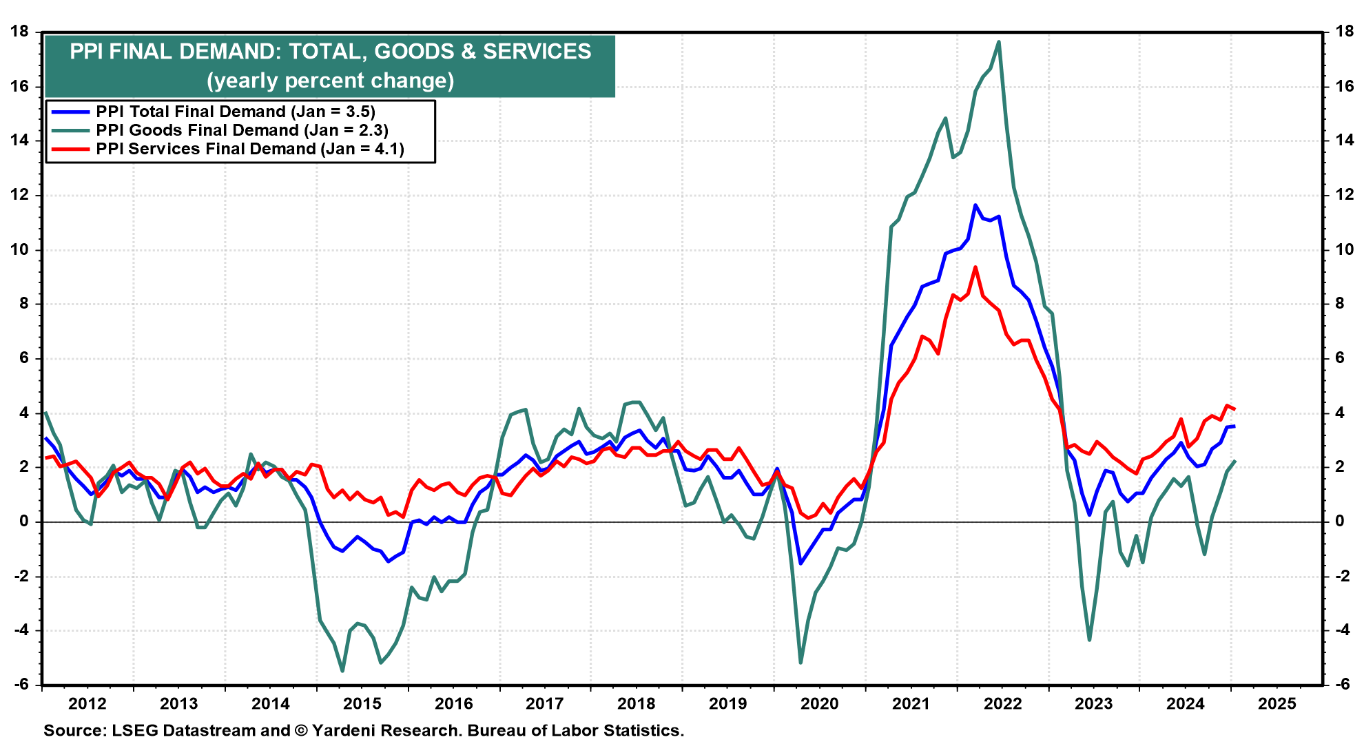 January's PPI rose 0.4% m/m, and December's increase was revised up from 0.2% to 0.5% m/m. The index is up 3.5% y/y (chart). PPI services inflation is above 4.0% y/y, and PPI goods inflation rose to its highest pace since 2022. The PPI inflation rate has been rising since June 2023, when it was close to zero.