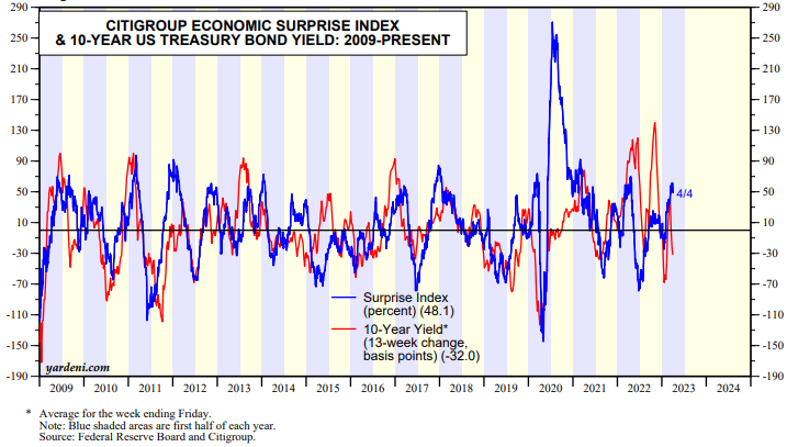 The latest batch of economic indicators have been weaker than expected. Today, we learned, according to ADP, that private sector hiring rose by just 145,000 in March, down from 261,000 in February and below the estimate for 210,000. Annual pay rose at a 6.9% rate in March, down from 7.2% in February. The bond market seems to be anticipating that the Citigroup Economic Surprise Index has peaked recently and is about to fall sharply (chart).