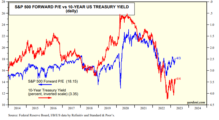 If so, then the Fed should be done. If the Fed persists with more rate hikes that would surely cause a credit crunch and a recession. Deflation might be the outcome of that dire scenario. Lower bond yields may be giving some support to the valuation multiples of various technology stocks for now, but a recession would surely revive last year's bear market in stocks (chart).