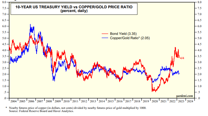 Meanwhile, the relationship between the bond yield and the copper/gold price ratio suggests that the yield could drop to 2.0% (chart). We think that could only happen if the economy falls into a recession caused by a credit crunch. That's not our most likely scenario. We are still assigning a 60% subjective probability to a soft landing and 40% to a hard one.