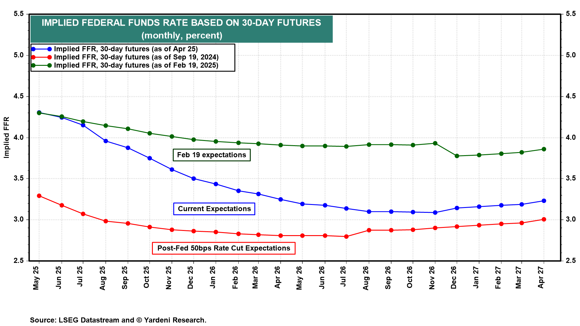 Federal funds rate (FFR) futures show that tariff-related growth fears are real, and the Fed will likely look through tariff-related price increases and cut the FFR. Futures suggest that the FFR will be cut from 4.33% to 3.50% by year-end, and continue to be cut through the first half of next year down close to 3.0% (chart).