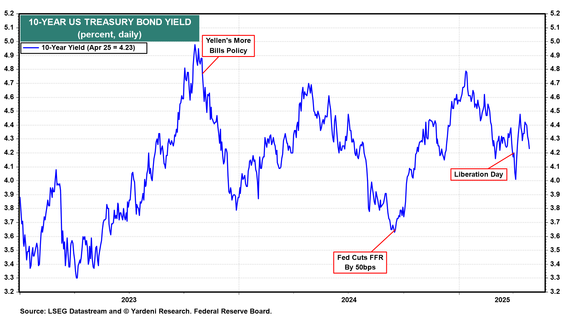 The S&P 500 is down roughly 10% from its record high on February 19. Considering Trump's Tariff Turmoil (TTT), that's not too bad. Also recall all the angst unleashed when the 10-year US Treasury bond yield spiked from 4.00% to 4.50% right after President Donald Trump announced his "Liberation Day" reciprocal tariffs. Now it is back down to 4.20% (chart). The stock and bond markets may be getting support from expectations that the Fed may ease soon.