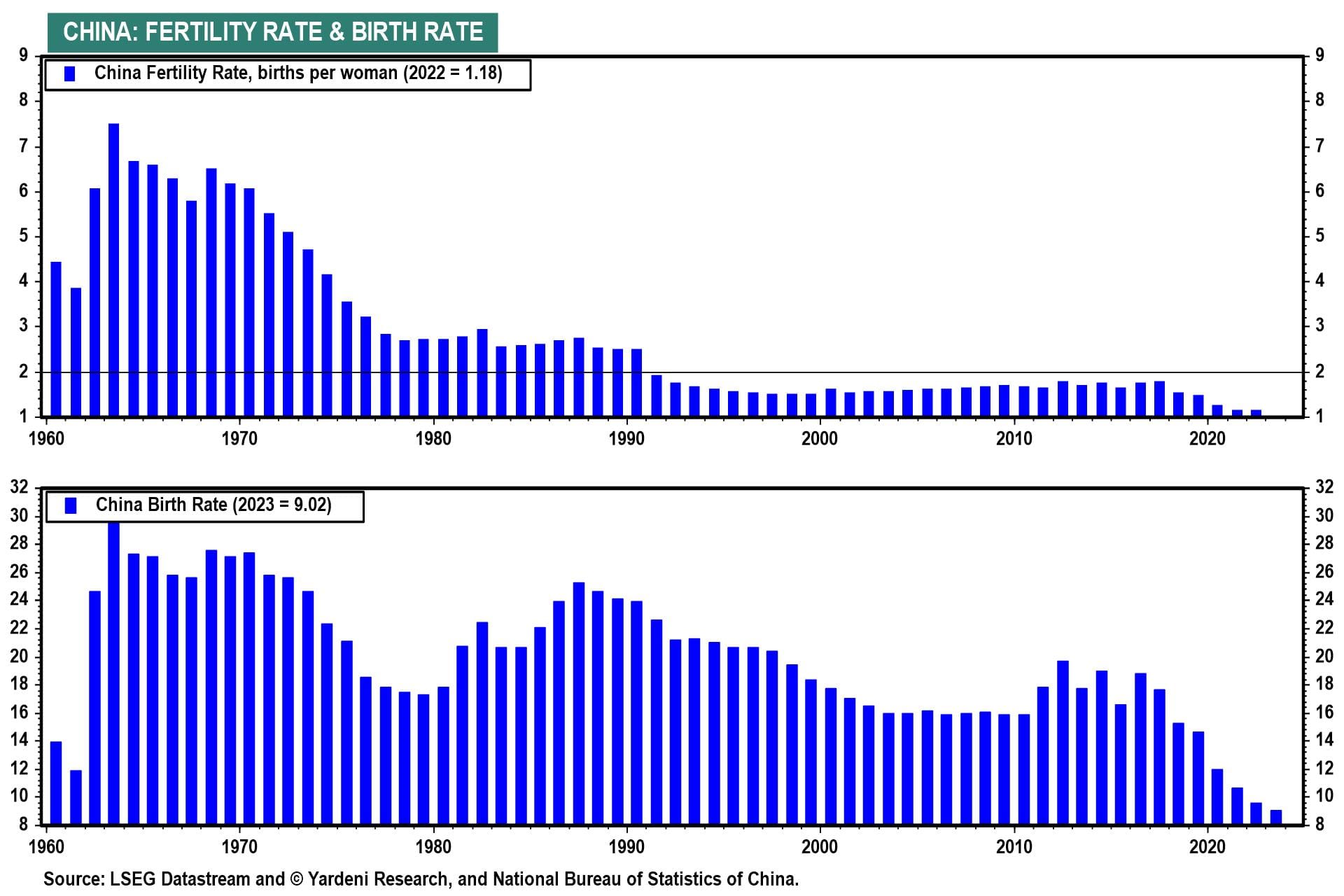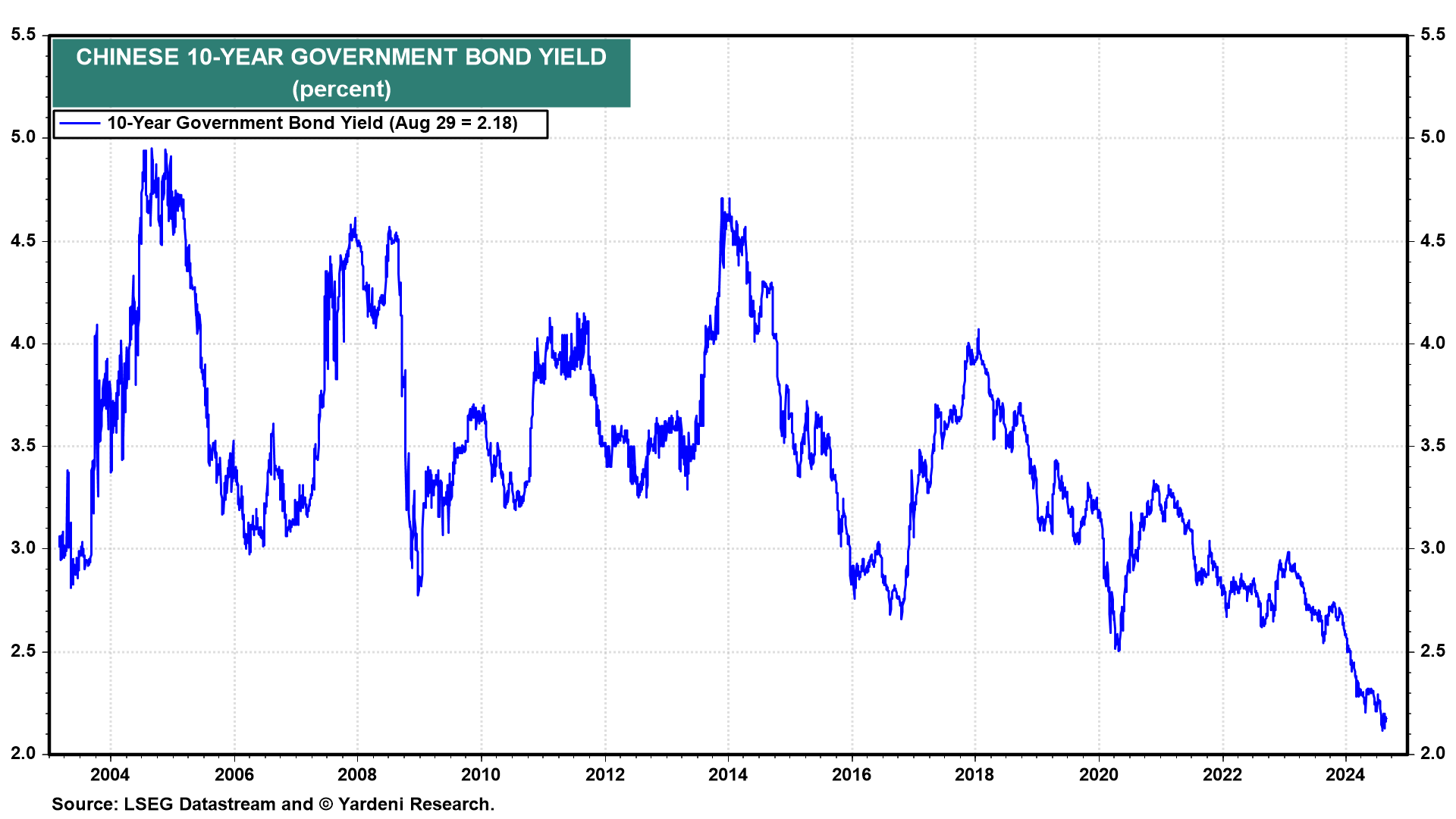 (8) The Chinese 10-year government bond yield has plunged since the start of last year from 3.00% to 2.18% currently.