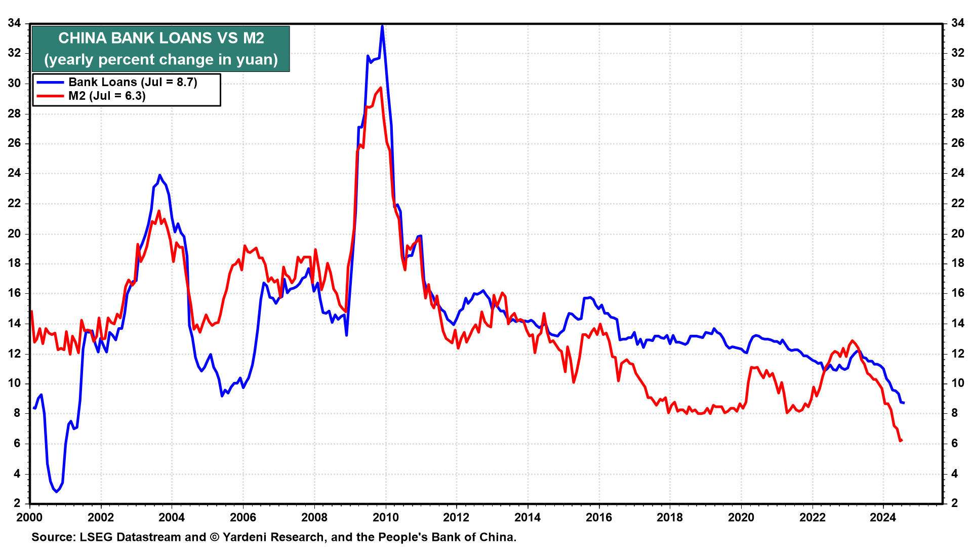 (5) The growth rates of Chinese bank loans and M2 are falling rapidly.