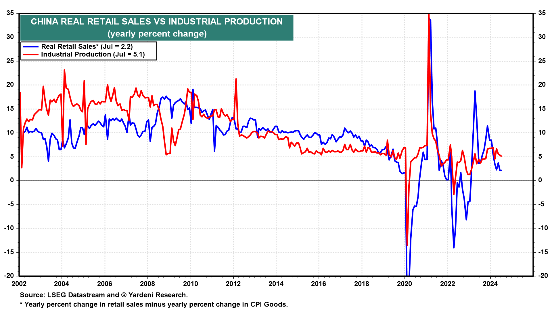 (4) China's real retail sales growth is weak and exceeds the growth of industrial production.