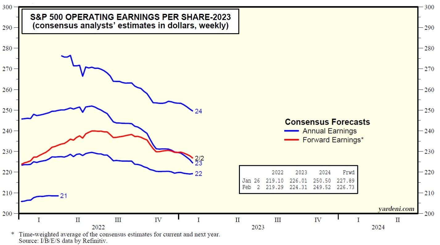 First the bad news: Industry analysts are continuing to cut their earnings estimates for this year and next year (chart). Nevertheless, as of the February 2 week, the analysts collectively still were projecting an increase this year of 2.3% to $224.31 and an increase of 11.2% next year to $249.52. Those estimates are consistent with a mid-cycle slowdown in earnings this year and better growth next year.