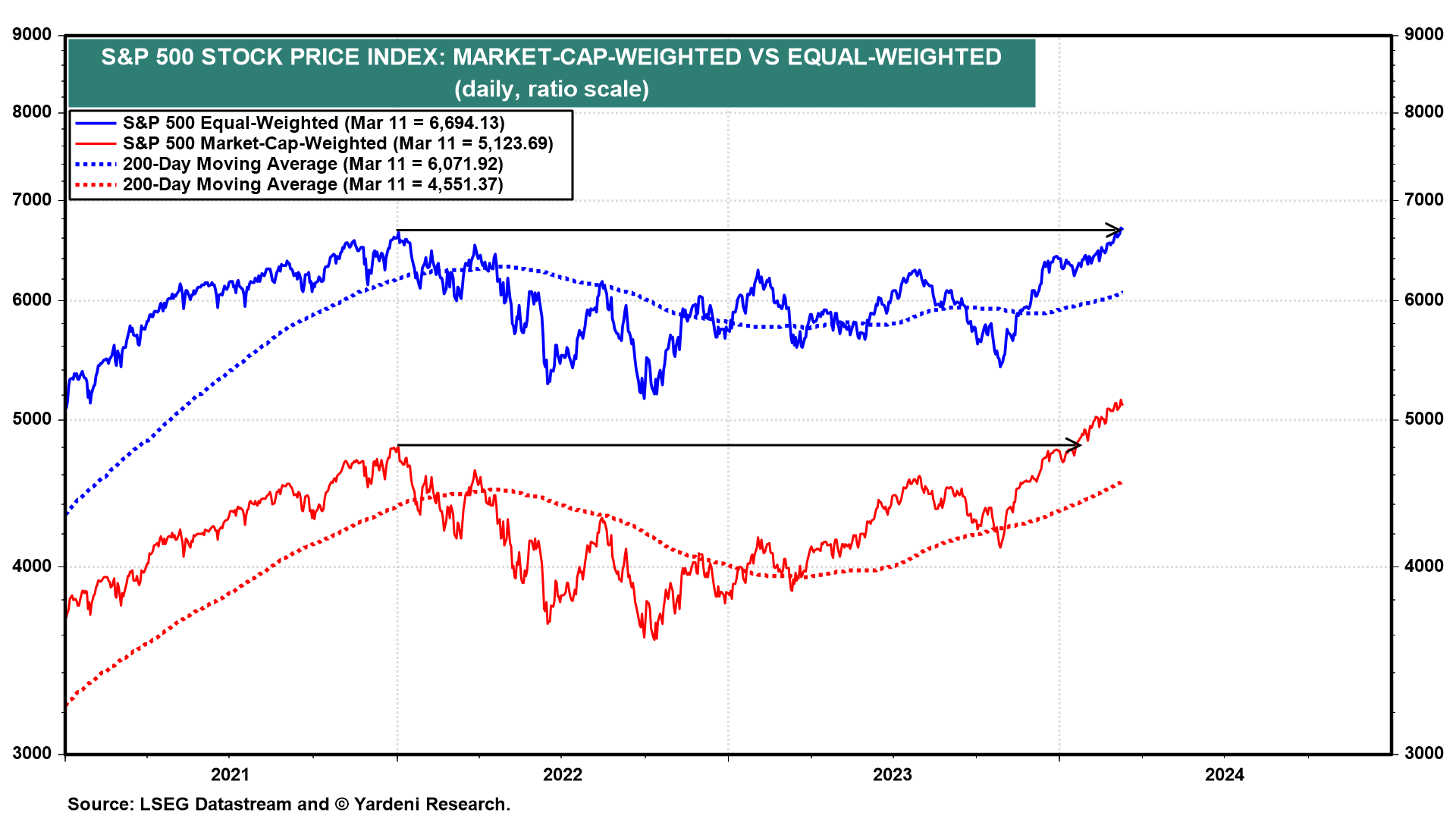 The S&P 500 market-weighted stock price index is up 43.2% since the current bull market started on October 12, 2022 (chart). The equal-weighted version of the index is up 29.5% since it bottomed on September 30, 2022. This confirms our view that the bull market has been a broad one all along. The equal-weighted index has certainly been in a bull market, it just hasn't been as awesome as the one for the market-cap-weighted index. The former just rose to a new record high, while the latter did so in mid-January.