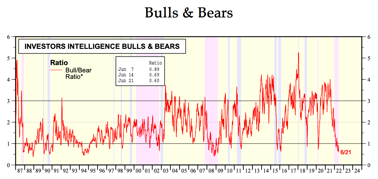 (1) The Bull/Bear Ratio (BBR) was below 1.00 for the eighth consecutive week this week. It slipped for the third week to 0.60 this week—the lowest reading since early March 2009, which was when the last bear market bottomed during the Great Financial Crisis! The BBR has been bouncing around 1.00 since late February.