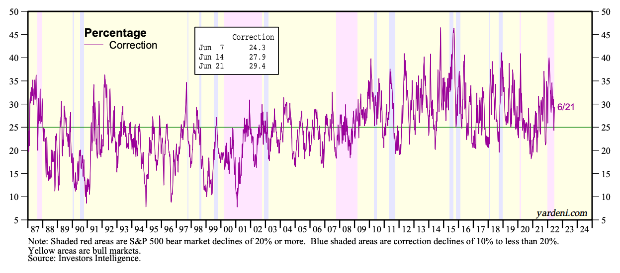 (3) The AAII Sentiment Survey dated June 16 showed that the percentage of individual investors expecting stock prices to fall over the next six months is above 50% for the fifth time in eight weeks. The latest survey also shows short-term optimism about stocks falling below 20%. The bull-bear spread is –38.9% and is unusually low for the 20th time in 23 weeks.